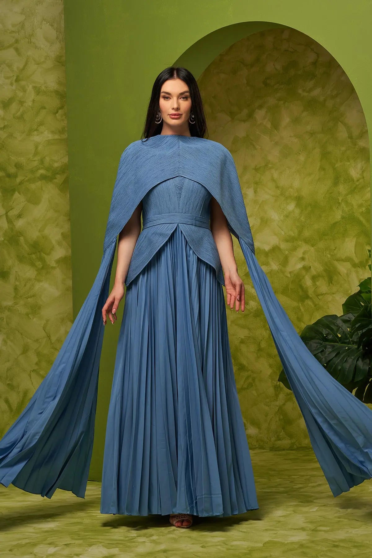 If you're looking for an Eid dress for woman that blends elegance with a statement look, this Blue Corded Gown is just perfect. The pleated detailing on the separate cape adds a graceful touch, making it ideal for festive gatherings. Flowing, sophisticated, and effortlessly chic. This two-piece set is designed to make you feel special on Eid.