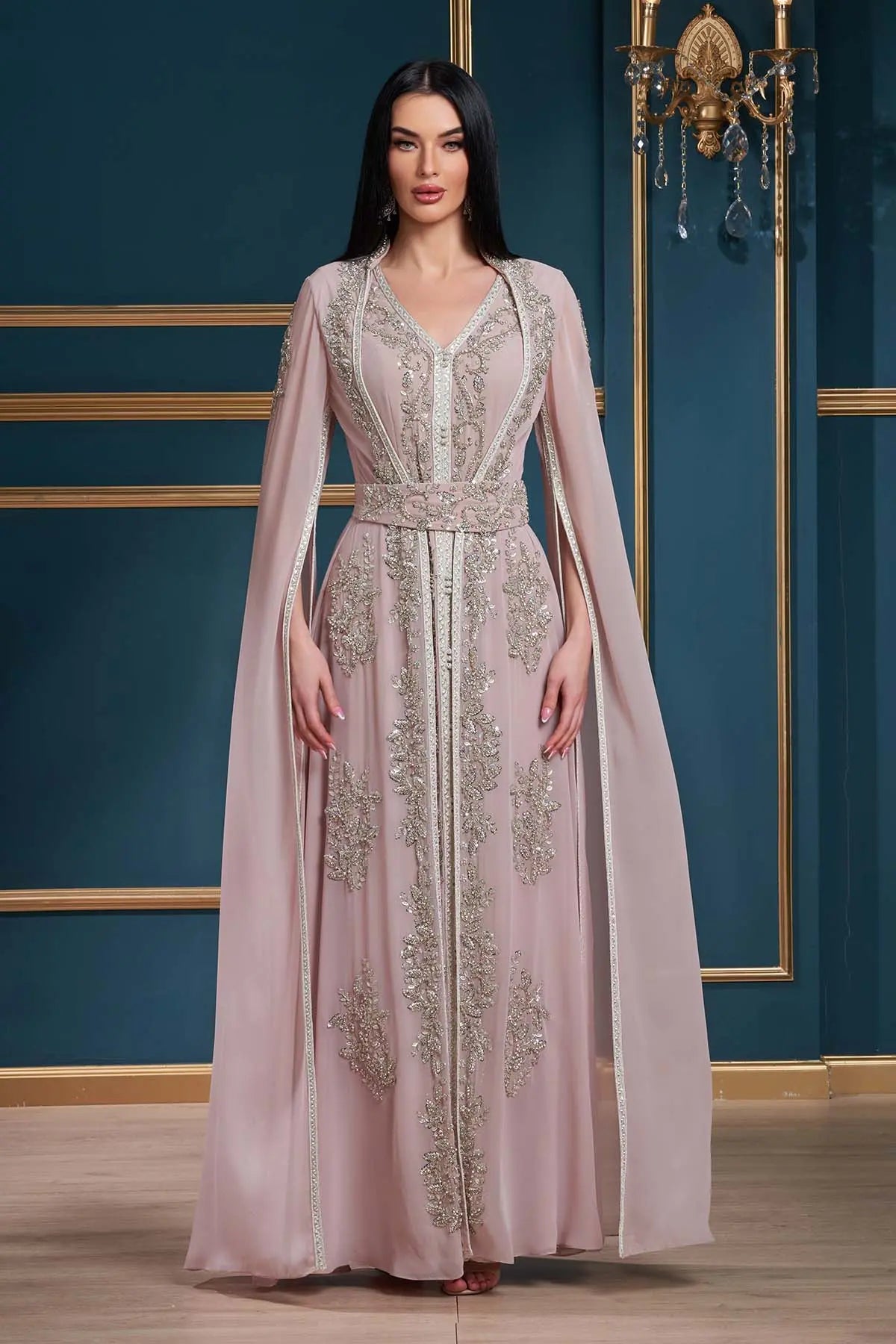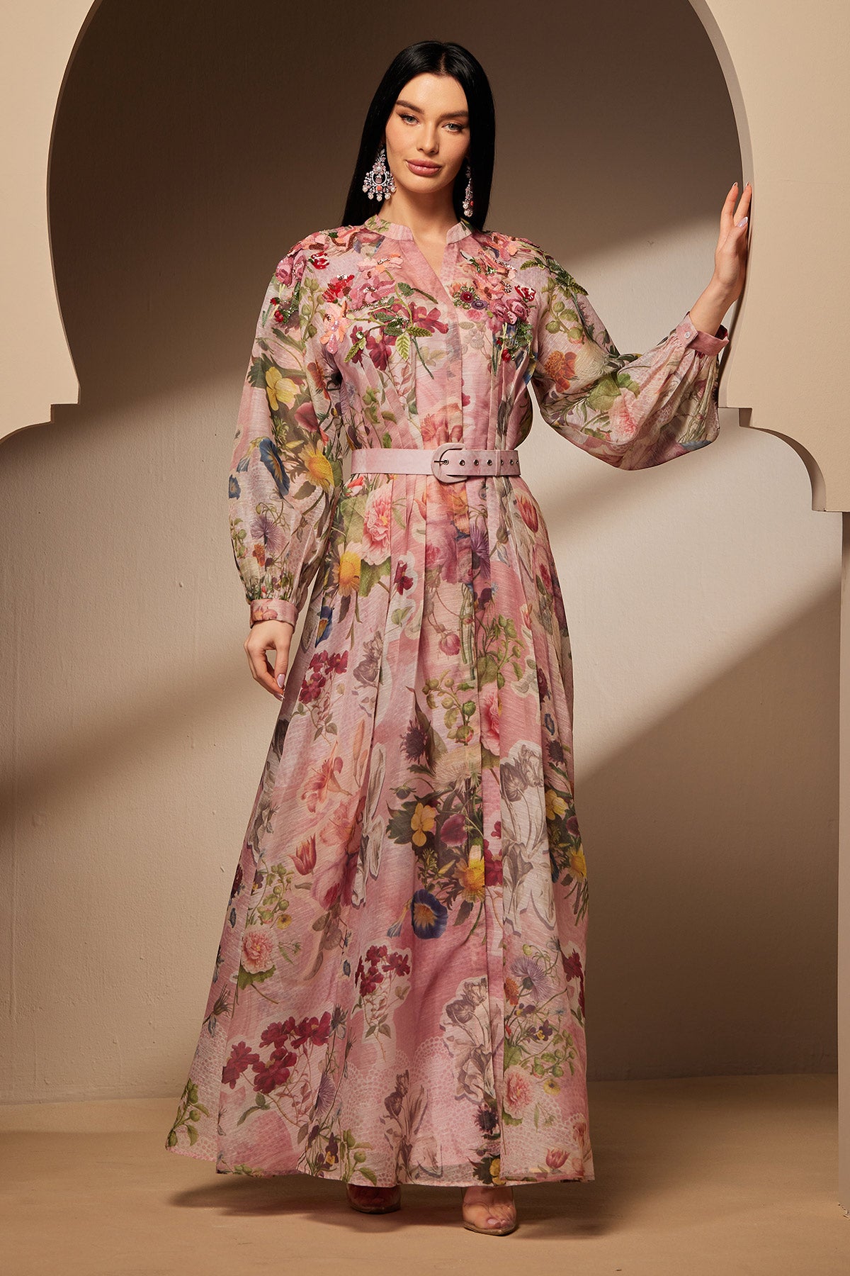 Soft, feminine, and effortlessly graceful, this Sea-pink Agathe Kaftan is everything you need for Eid. The delicate pleating at the waist flatters beautifully, while the multicolor floral embroidery adds a dreamy touch. With its separate belt and lustrous organza fabric, this kaftan is perfect for celebrating in style while staying comfortably chic.