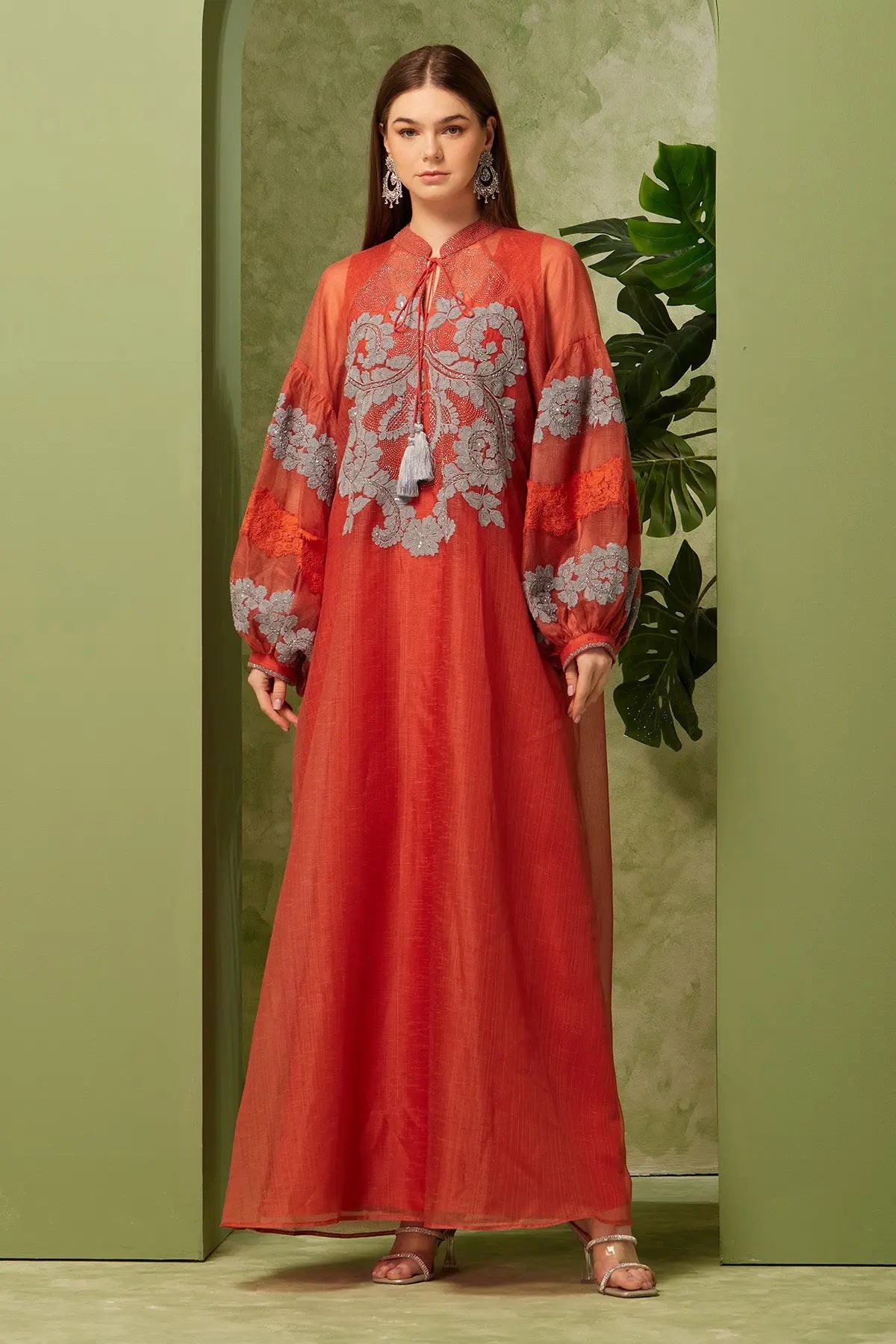 The Mazel D Kaftan in Rust is all about effortless charm with a touch of drama. The balloon sleeves add a graceful flow, while the luxe grey thread and bead embroidery create a striking contrast. Finished with delicate lace detailing and a chic neck tie-up, this piece is perfect for an elegant yet relaxed Eid look.