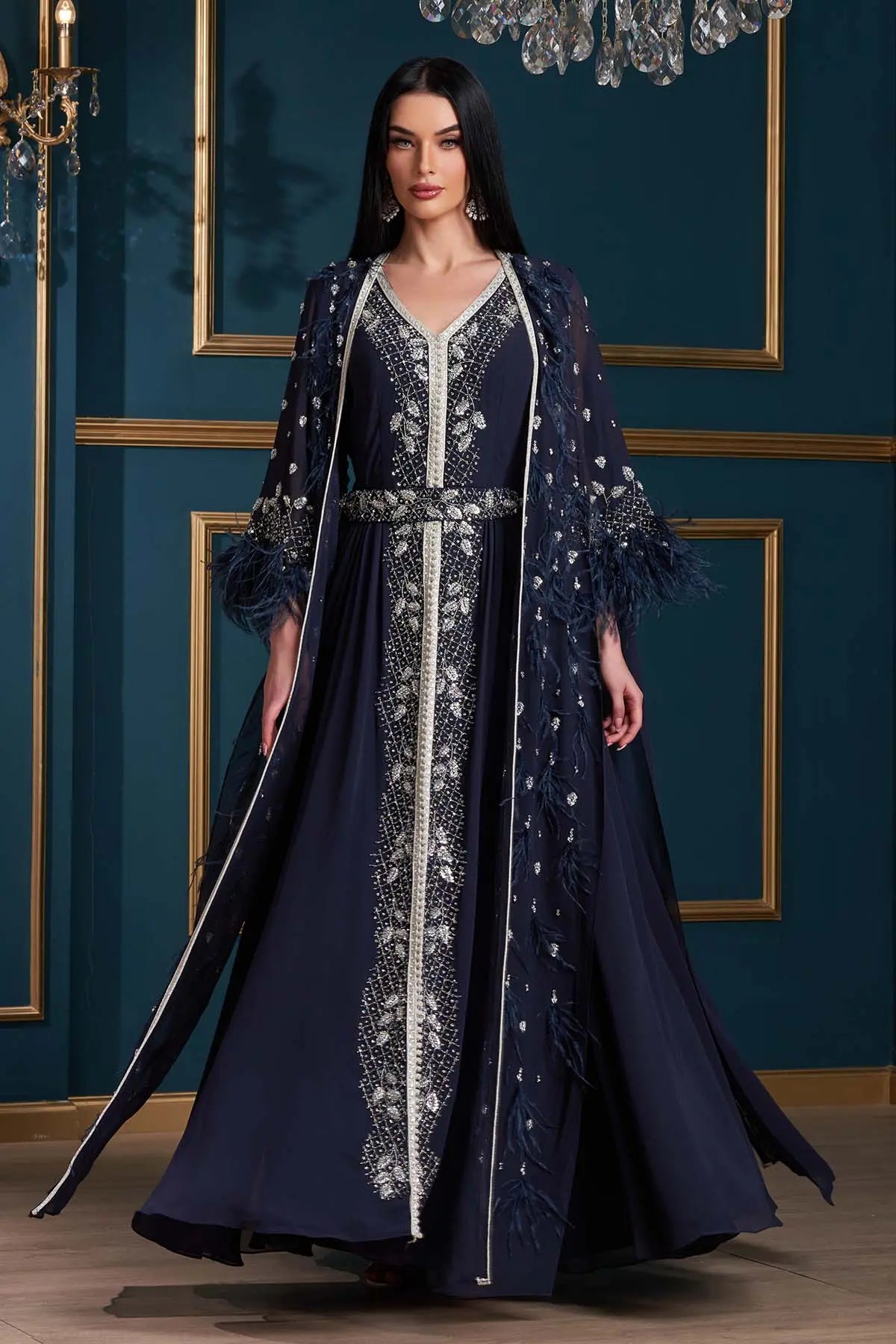 The Ayat Moroccan Kaftan in Navy Blue is made for moments that matter. The intricate metallic embroidery and feather details add just the right amount of drama, while the separate belt lets you switch up the look. Whether it’s for Eid or a special gathering, this two-piece set brings Moroccan craftsmanship to life with a modern touch.