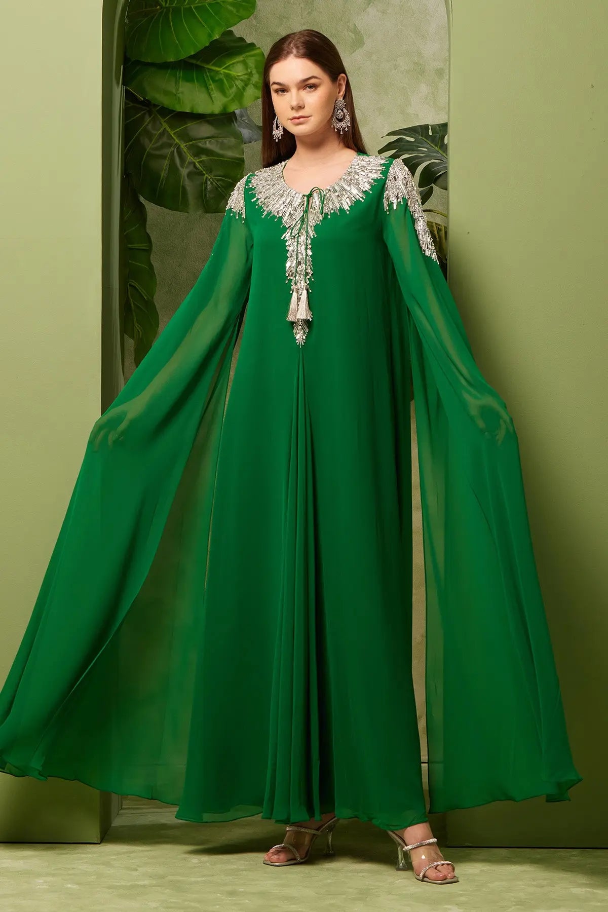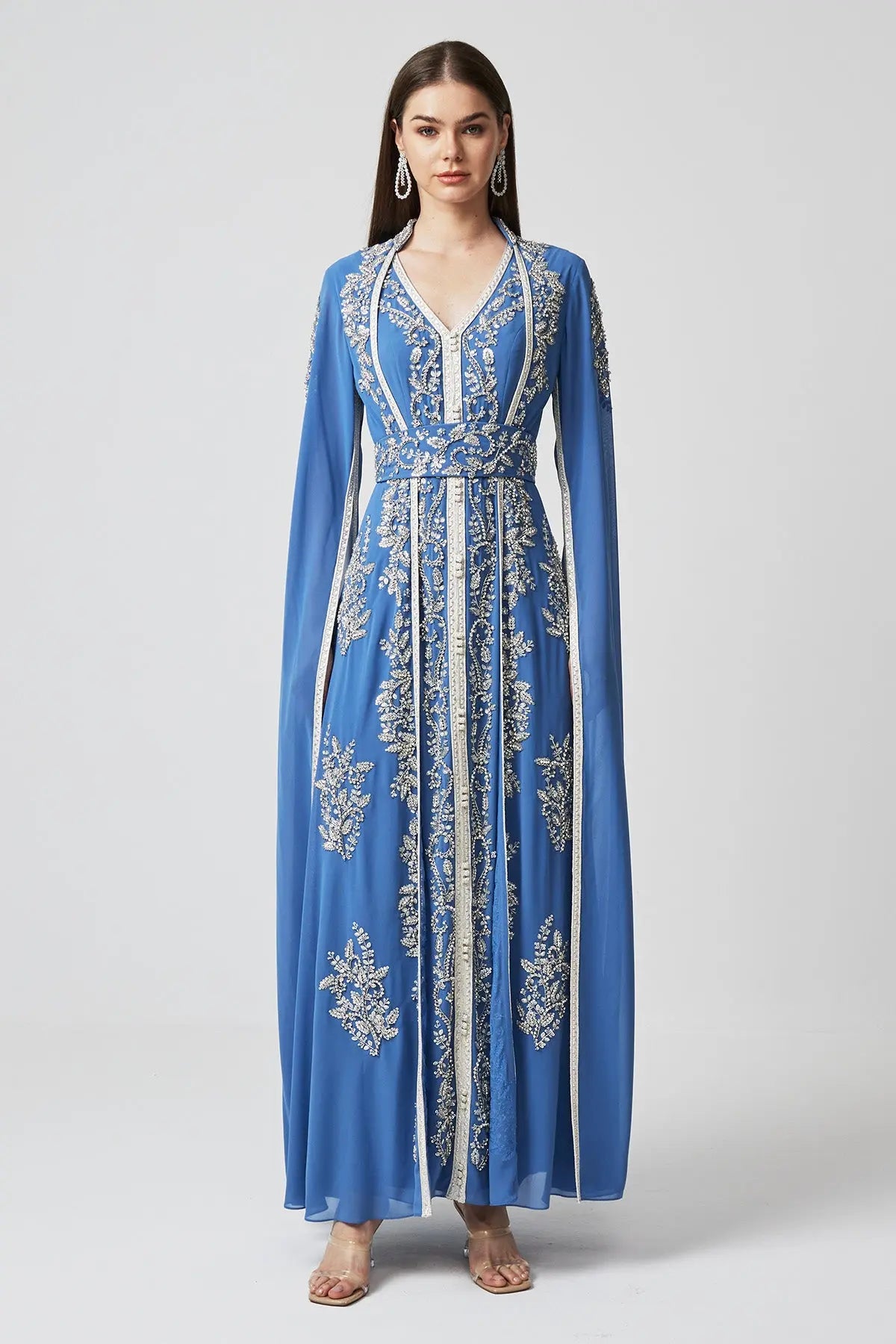 The Princess Kaftan in Islamic Green is all about graceful details. The drape sleeves create a soft, flowing silhouette, while the intricate silver crystal and bead embroidery add just the right amount of shimmer. Crafted to feel as good as it looks, this kaftan is perfect for Ramadan gatherings, bringing elegance with every step.