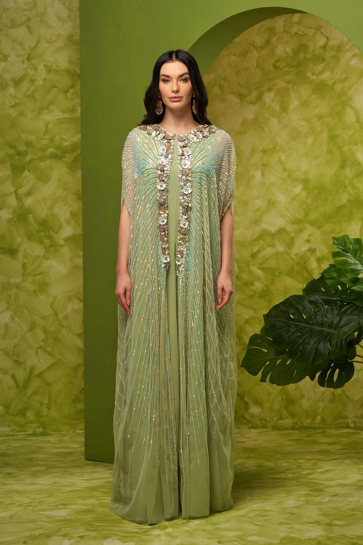 Some outfits don’t need an introduction - they just speak for themselves. The Sol Kaftan in Mint Green is one of them. With all-over sequins and bead embroidery, it catches the light beautifully, while the 3D floral detailing at the neck adds a soft, elegant touch. Made from airy tulle and crepe, it’s the perfect choice for Ramadan gatherings when you want to feel effortlessly put together.