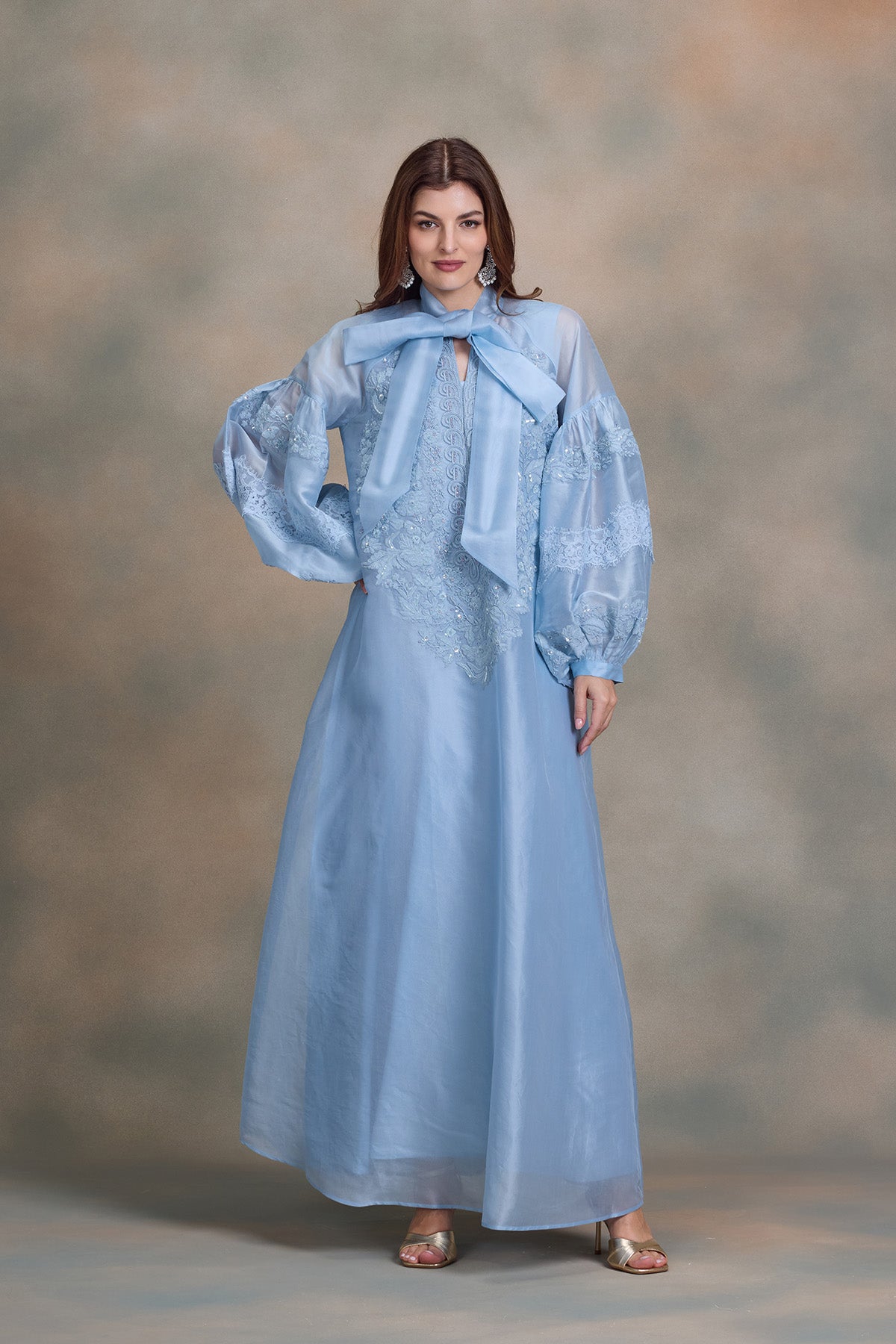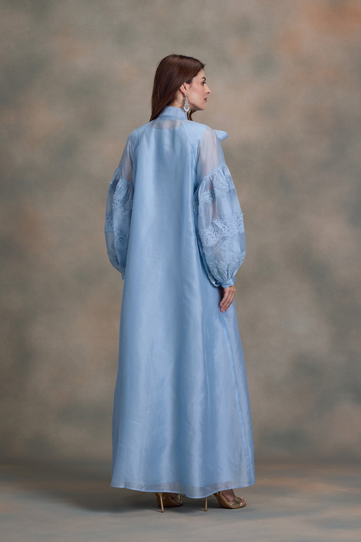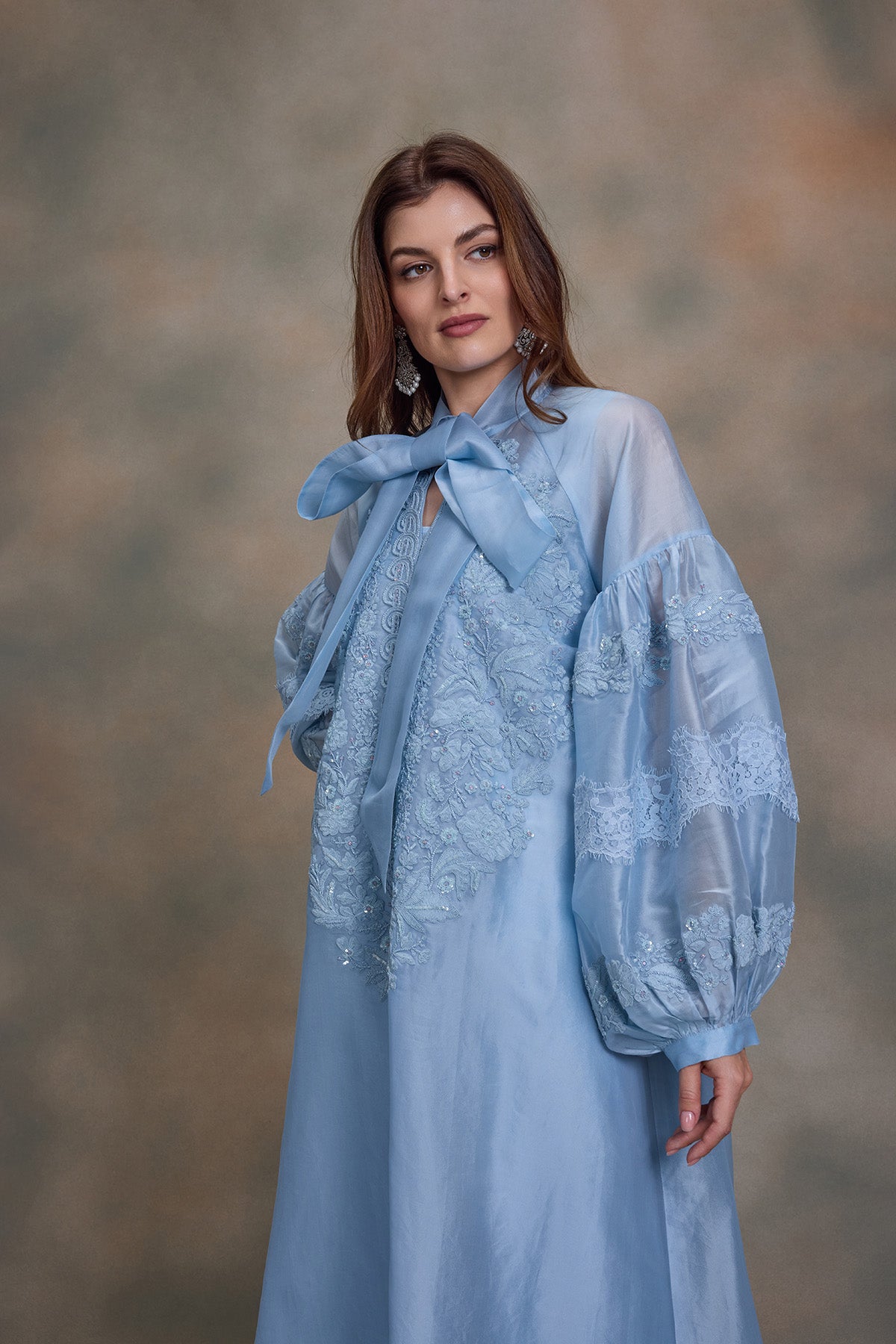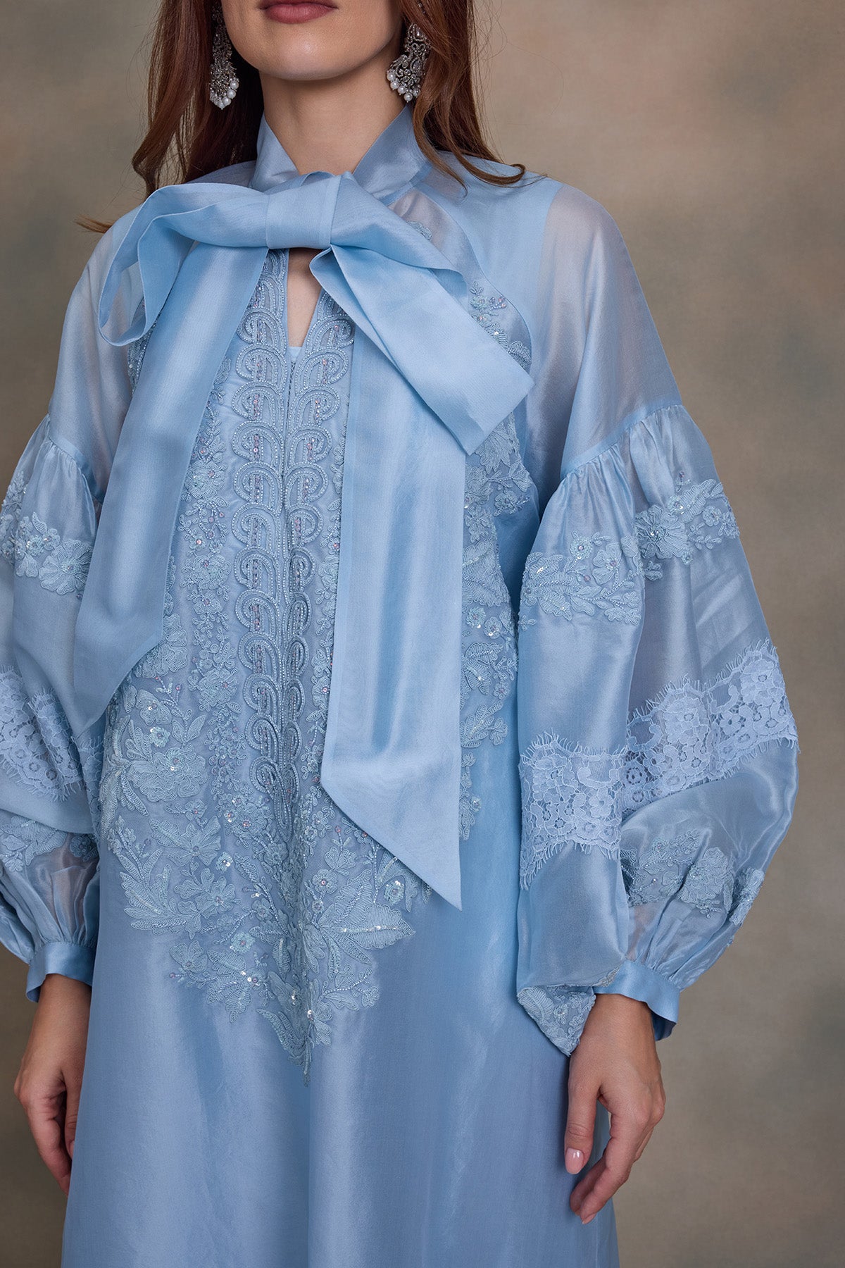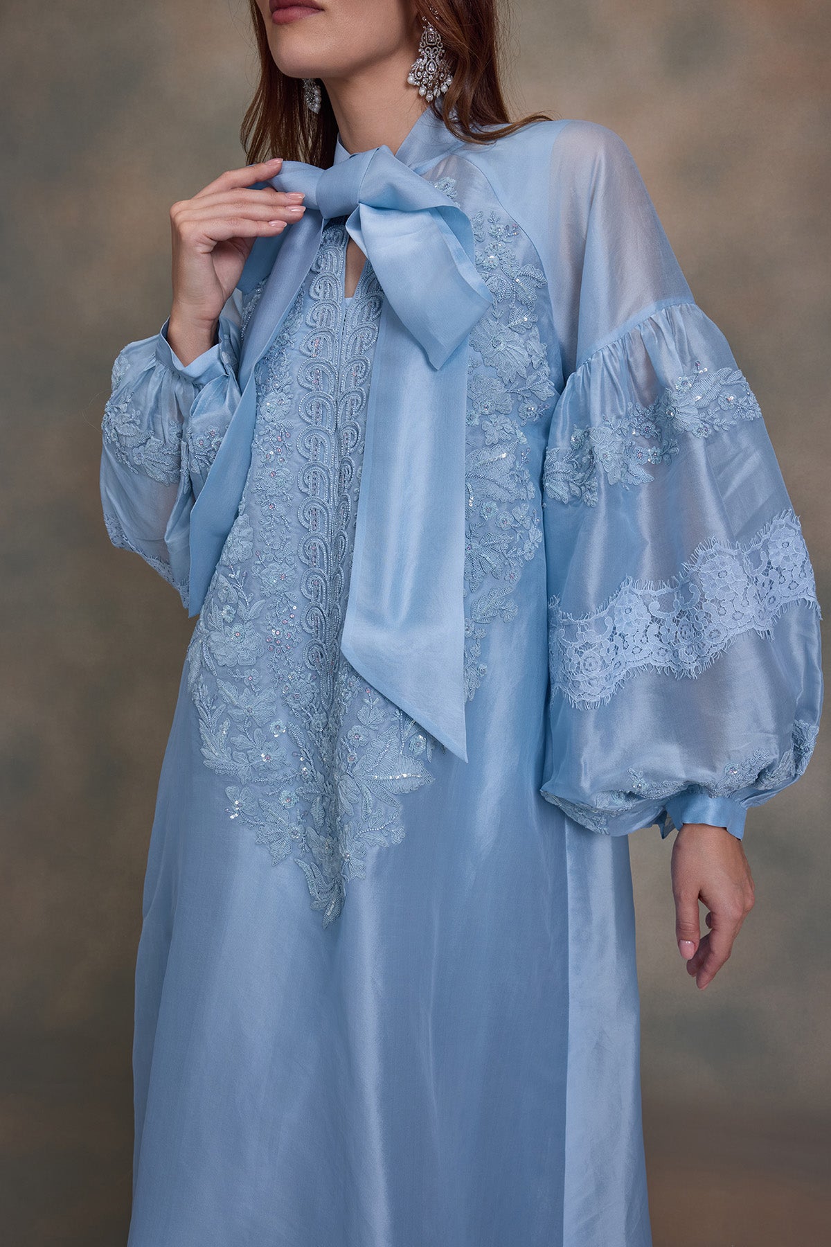 Balloon sleeves kaftan with luxe thread and beads embroidery - Lace detailing in sleeves - Neck Tie Up