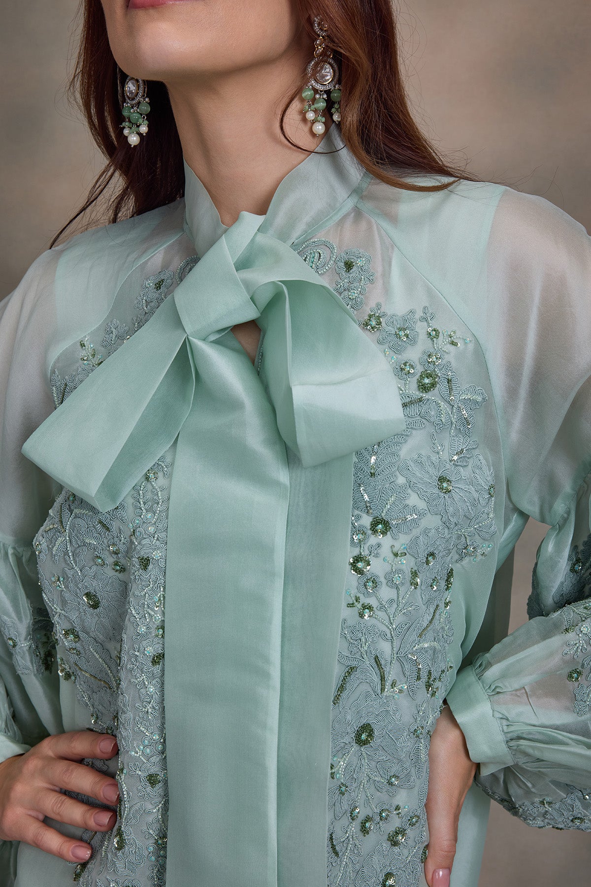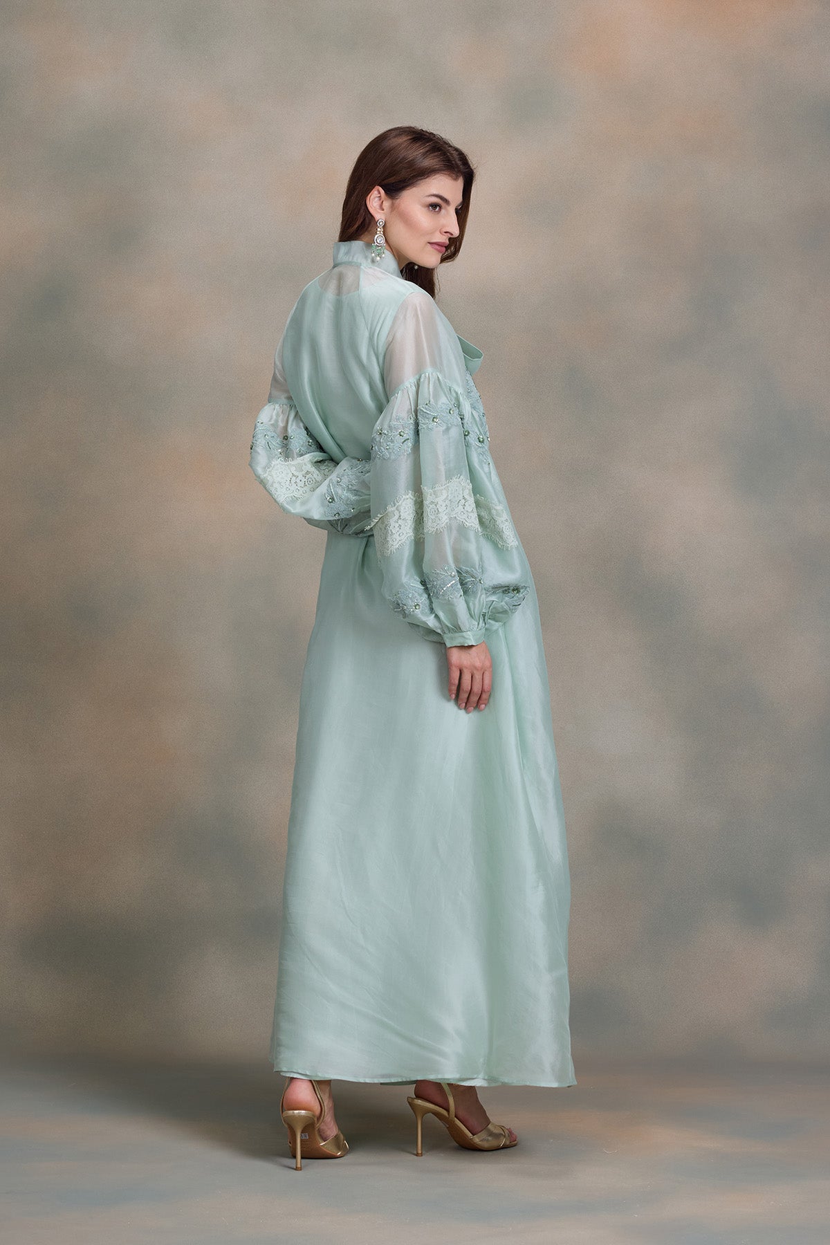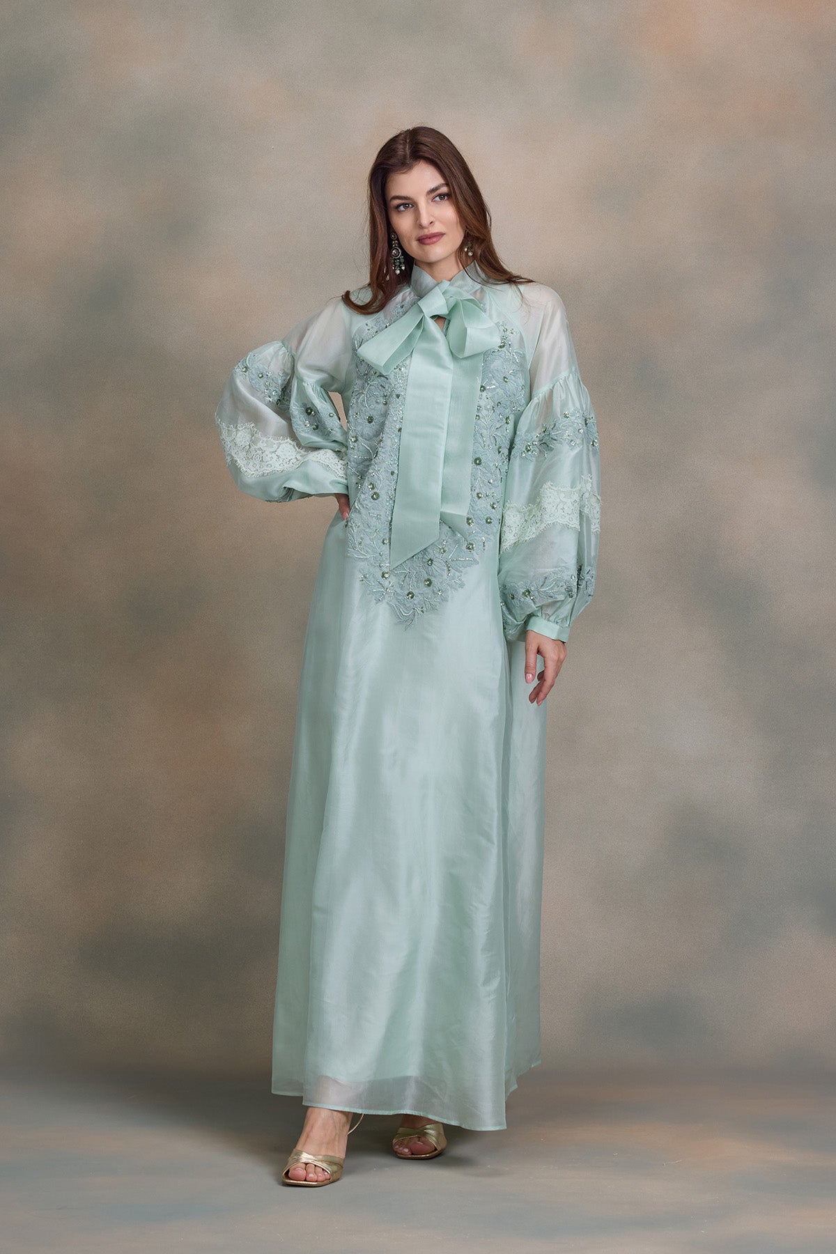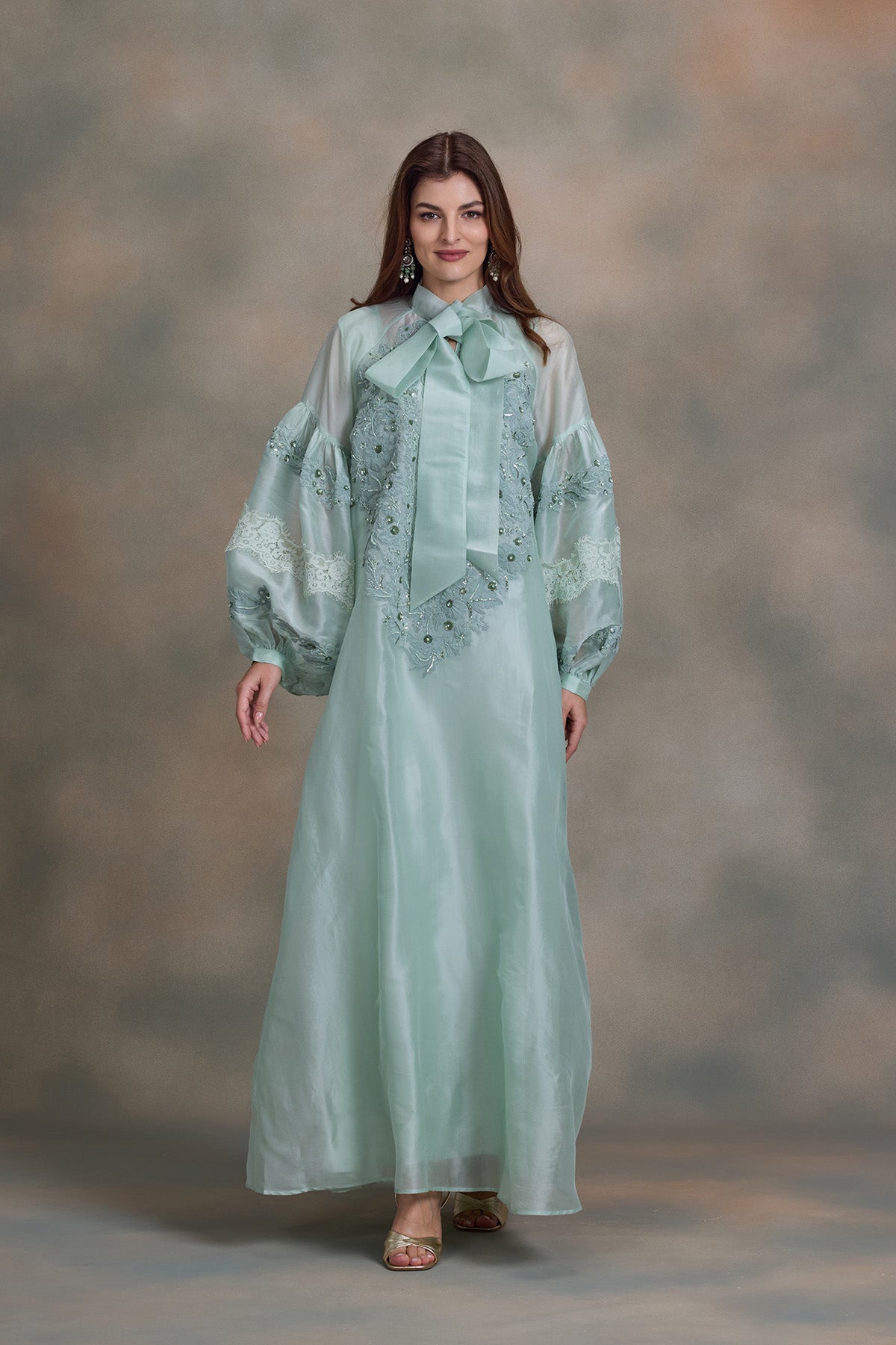 Balloon sleeves kaftan with luxe thread and beads embroidery - Lace detailing in sleeves - Neck Tie Up