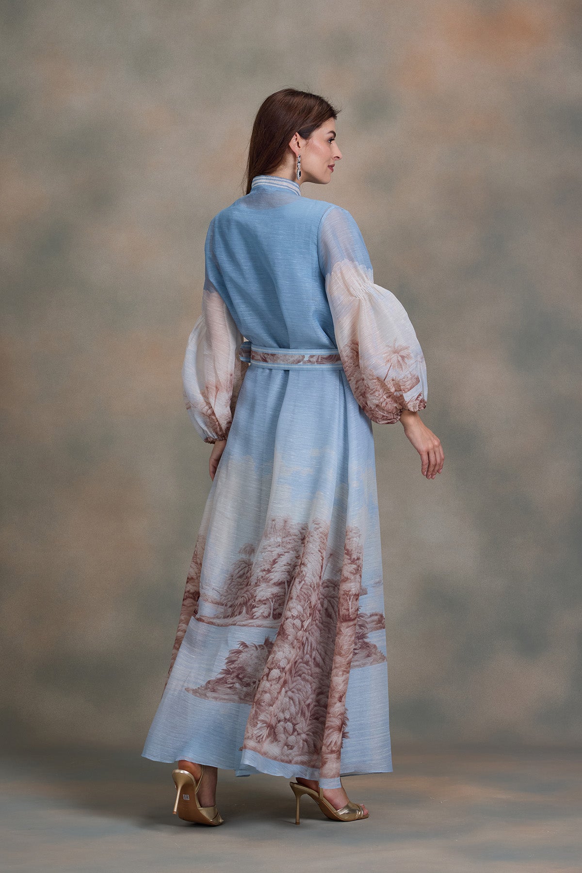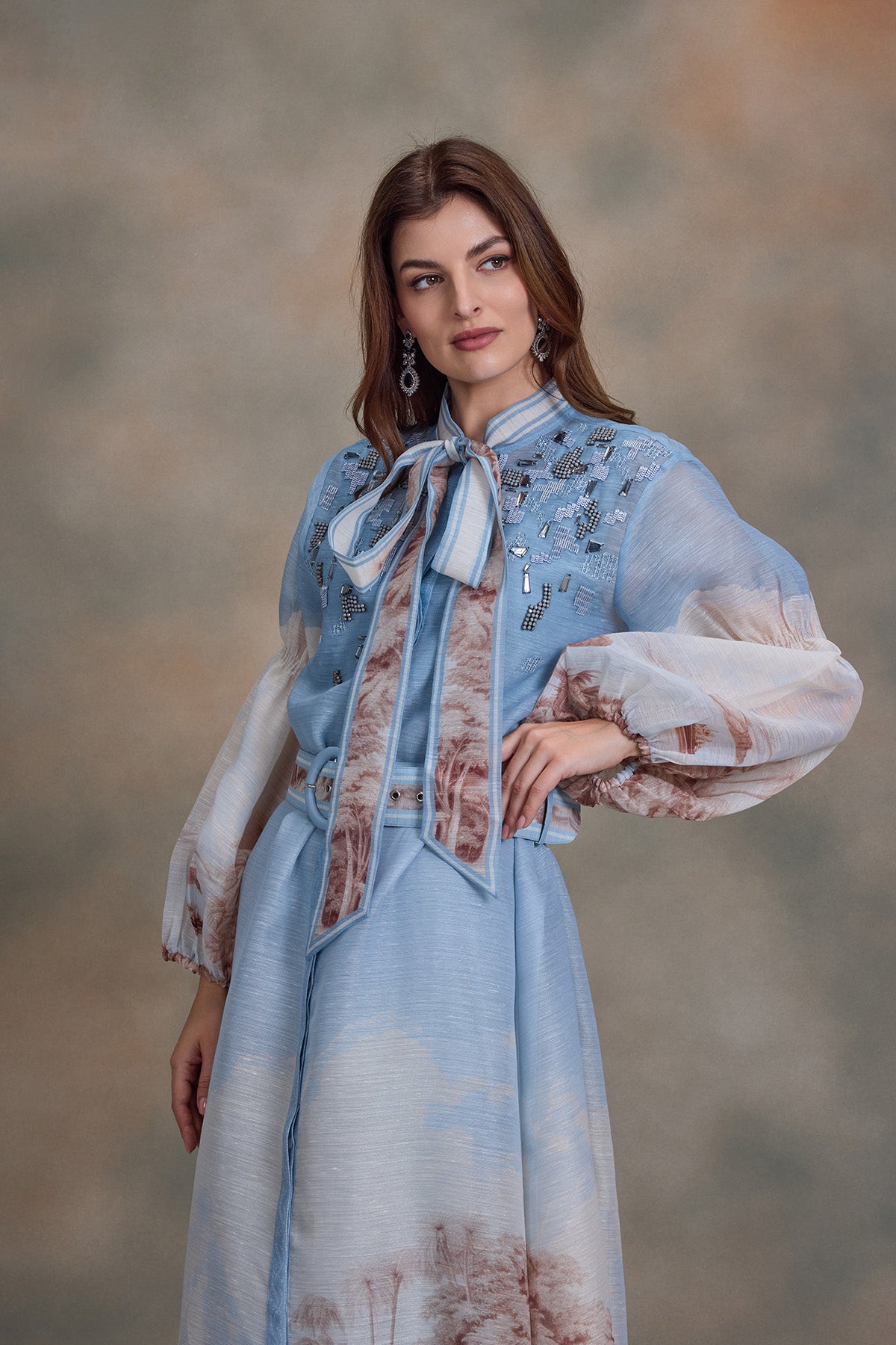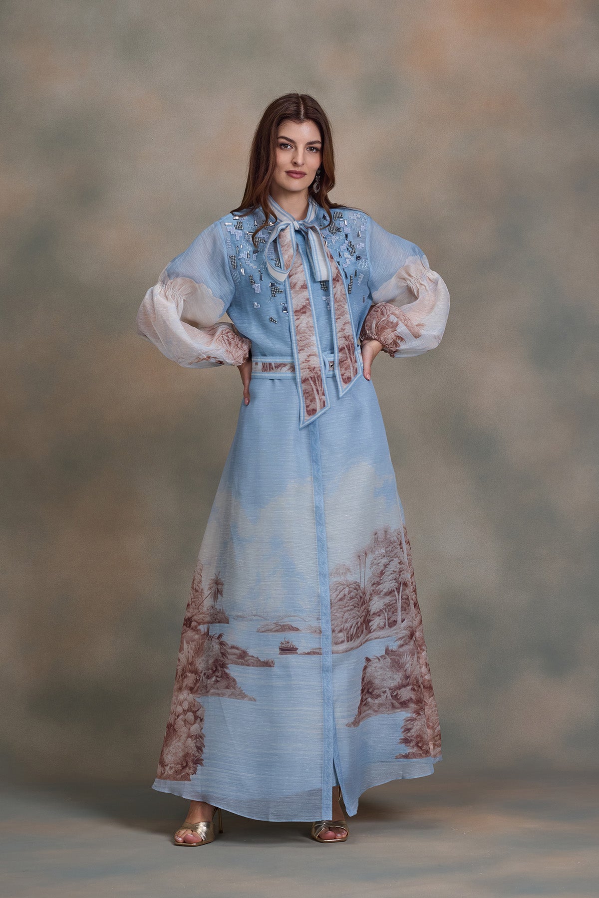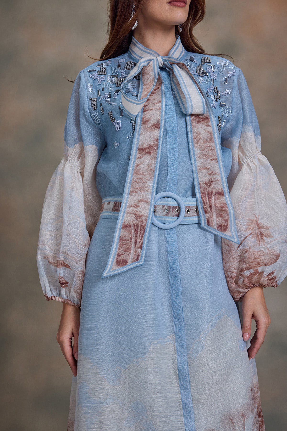 Long puff sleeves kaftan with tie up at the neck - Crystals and sequins embroidery at the bodice - Elasticated Sleeves - Separate Belt