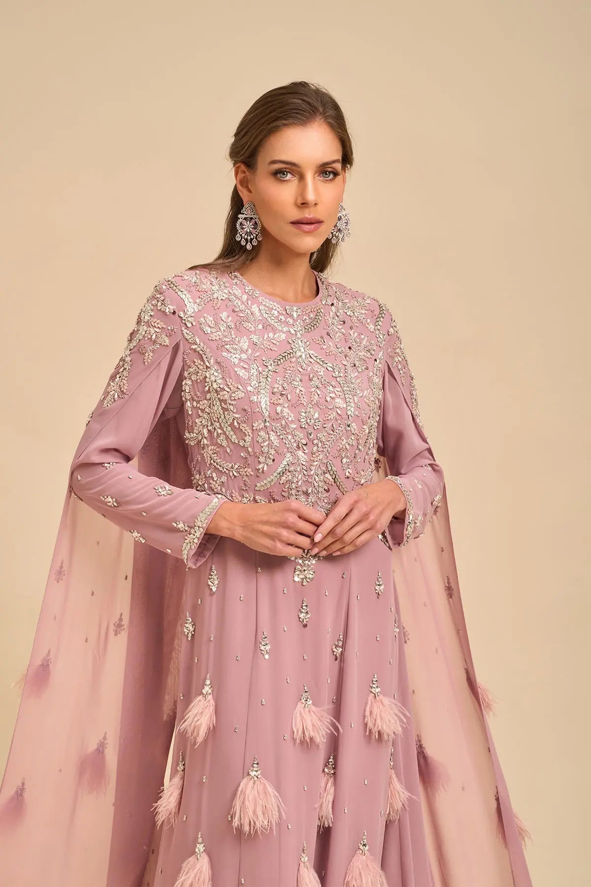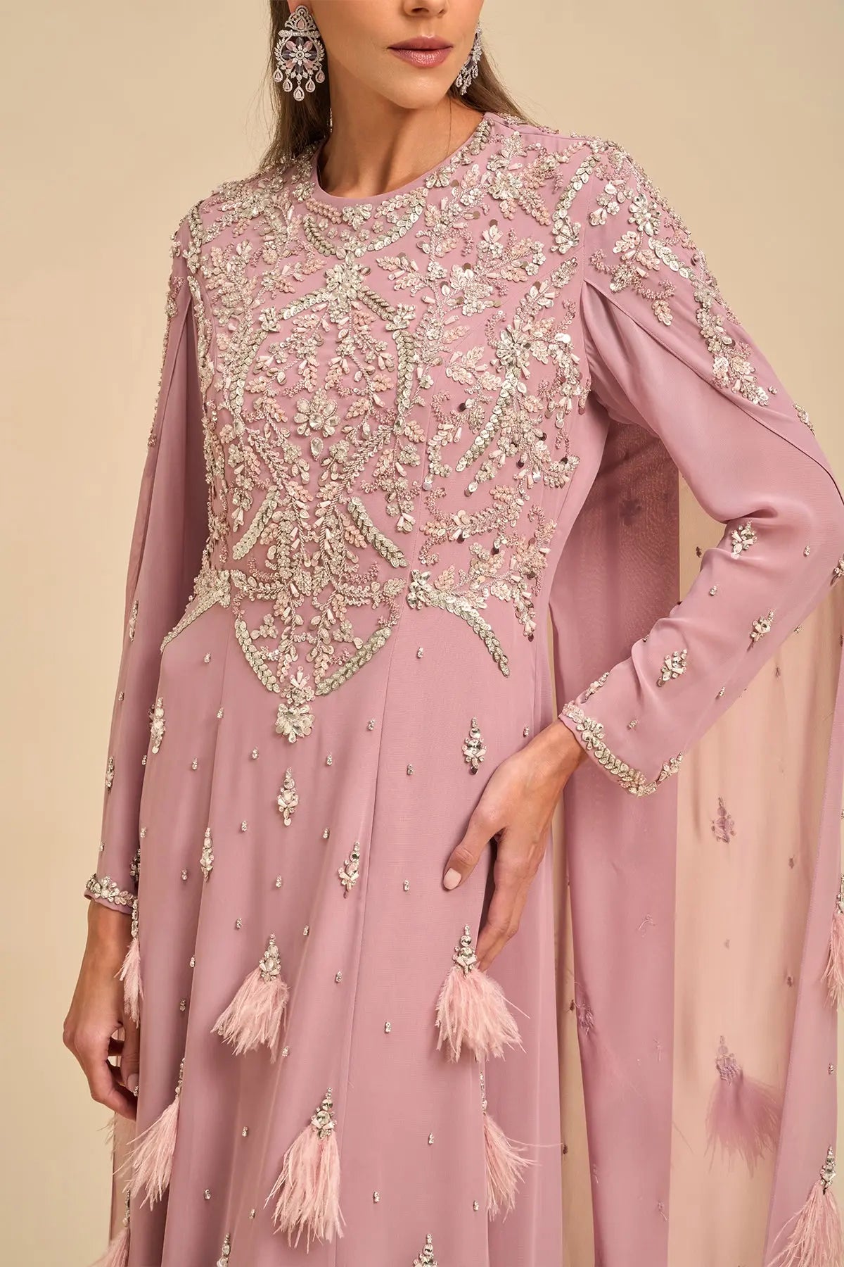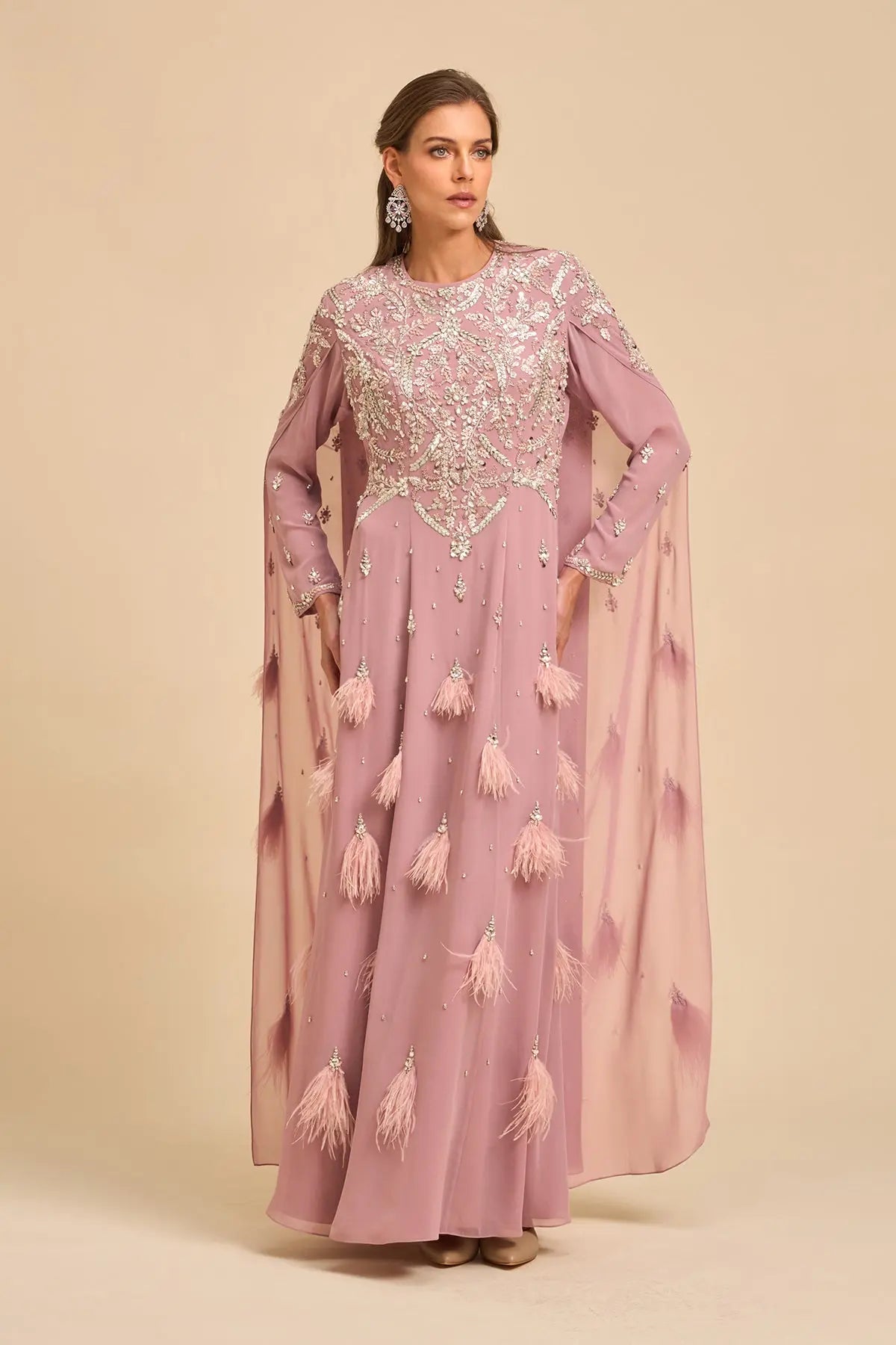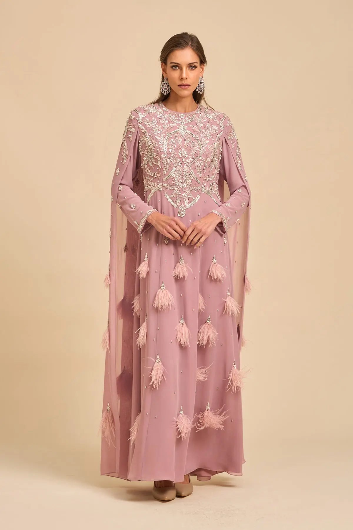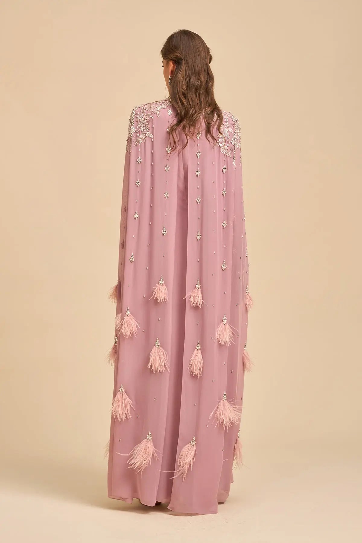 Luxe kaftan with cape - Luxe silver and feather squins embroidery