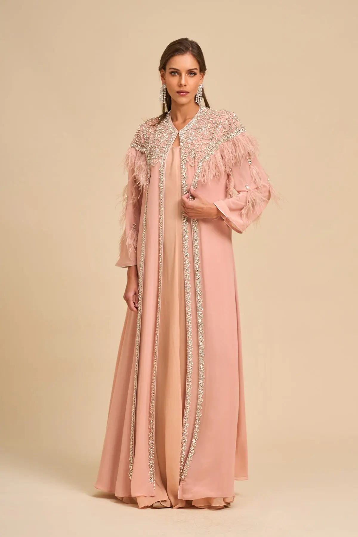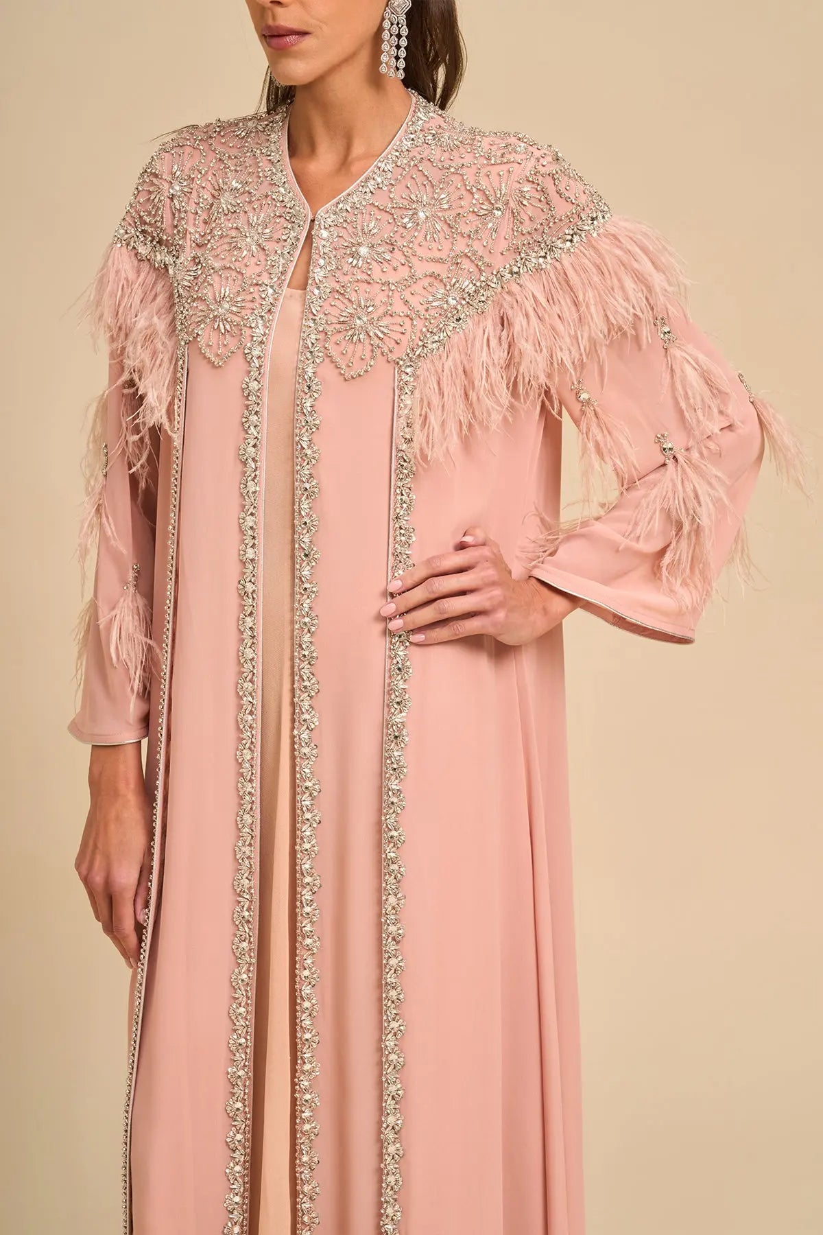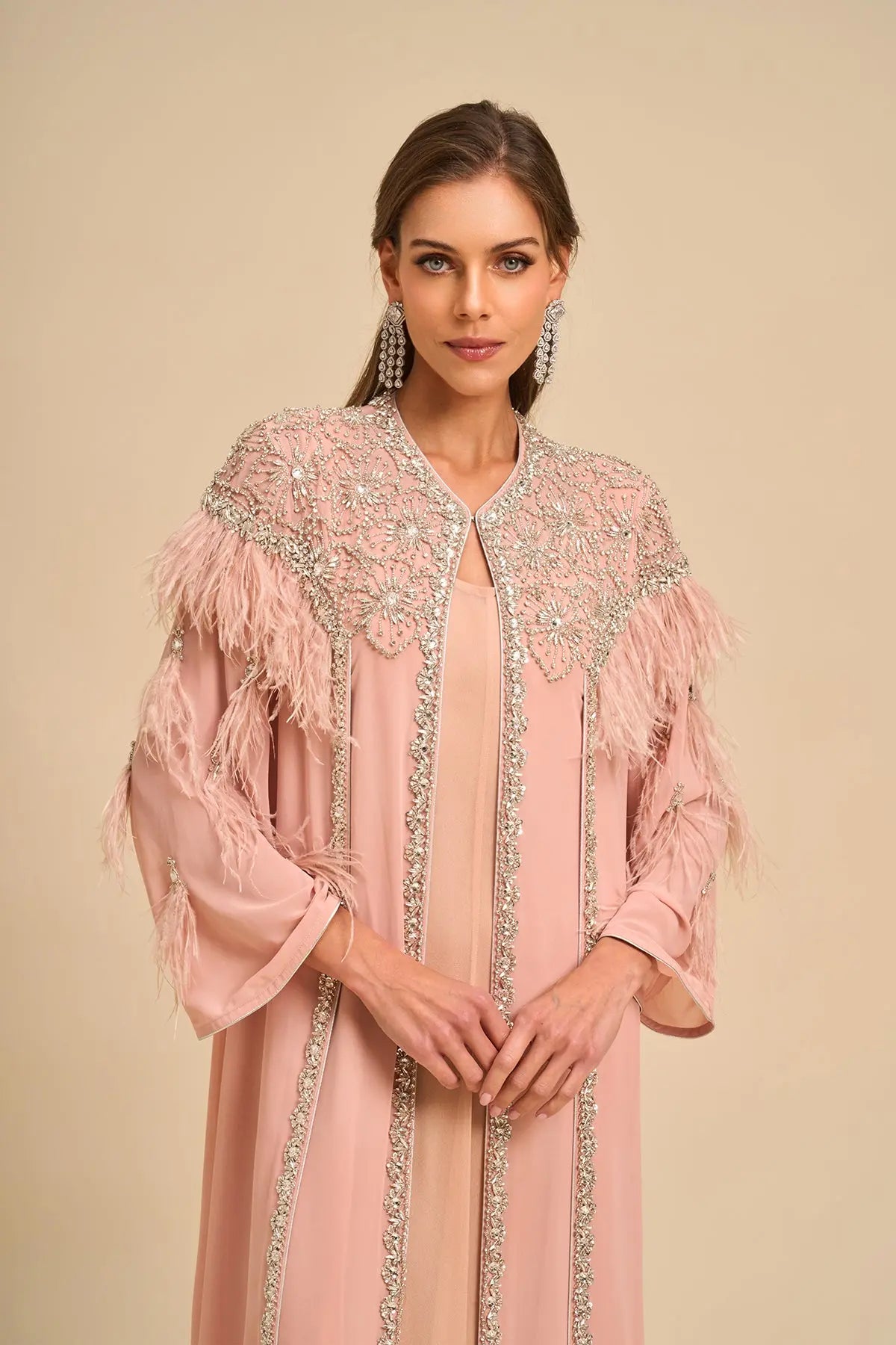 2 Piece Moroccon Cape Set With Luxe Silver Crystals, Beads And Feather Embroidery