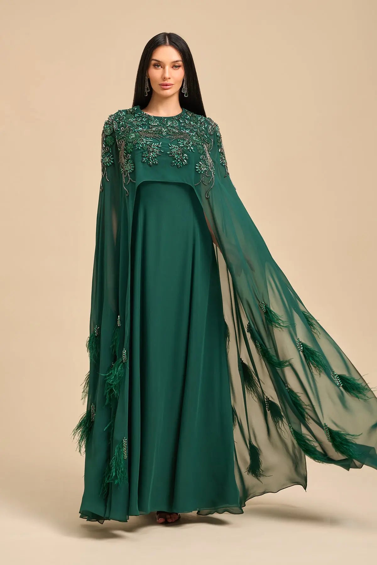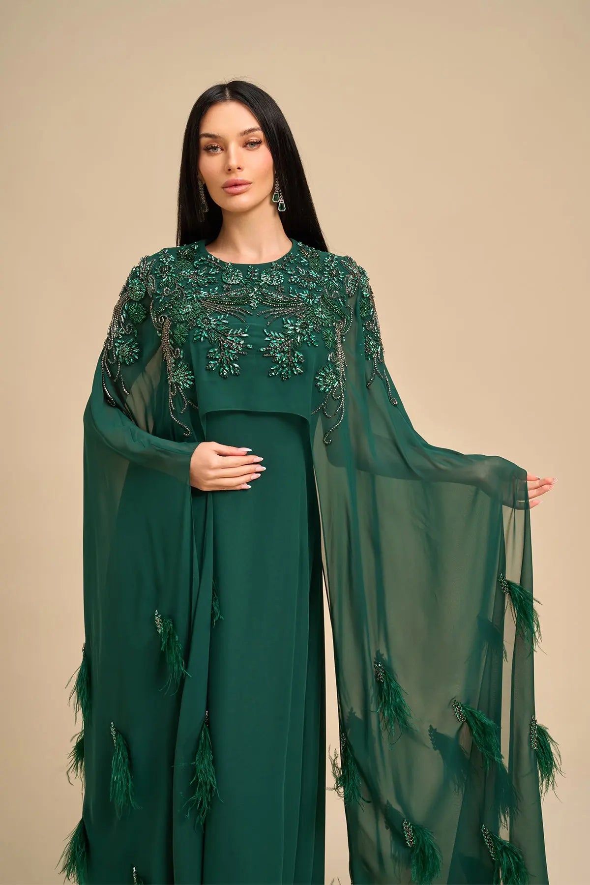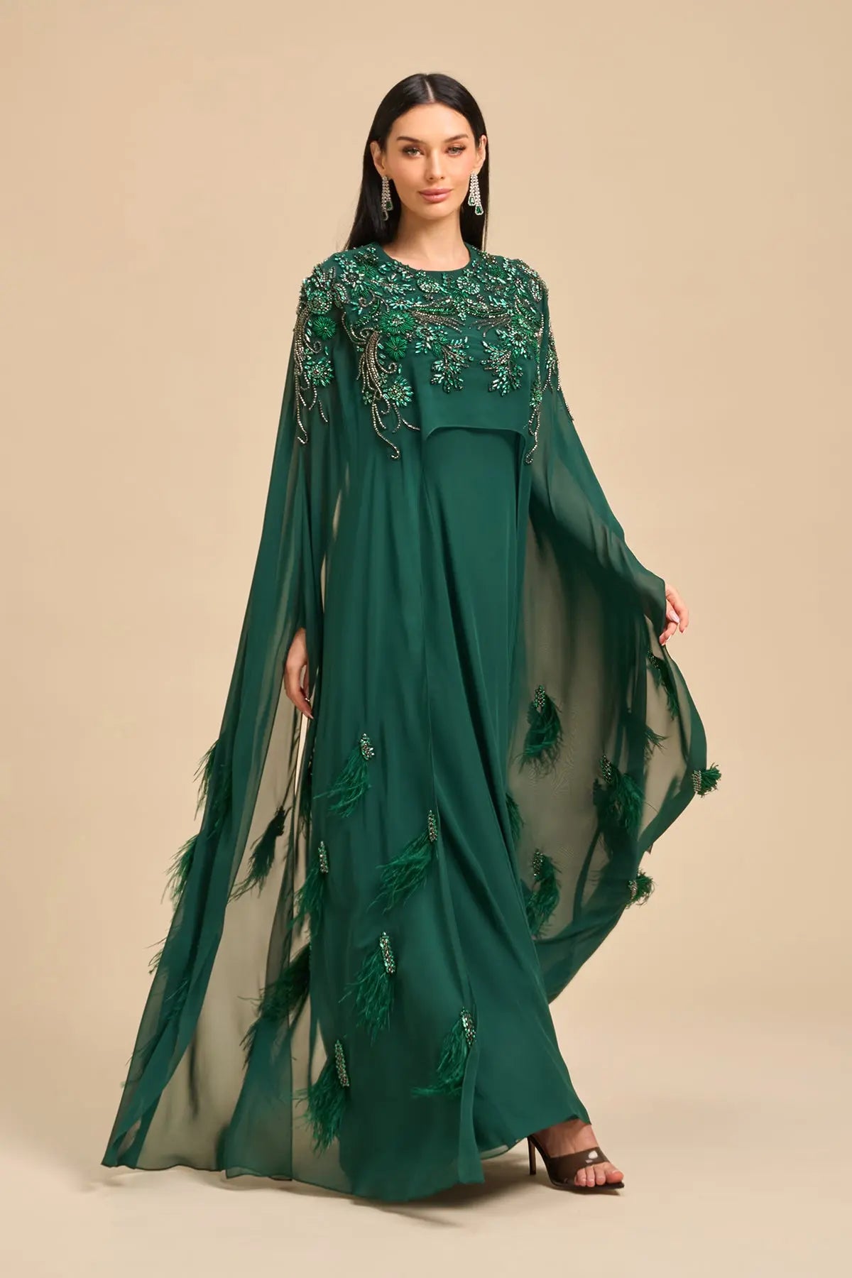 A classic evening wear kaftan dress with unique crystal, beads and luxe feather embroidery - Perfect for your next occasion
