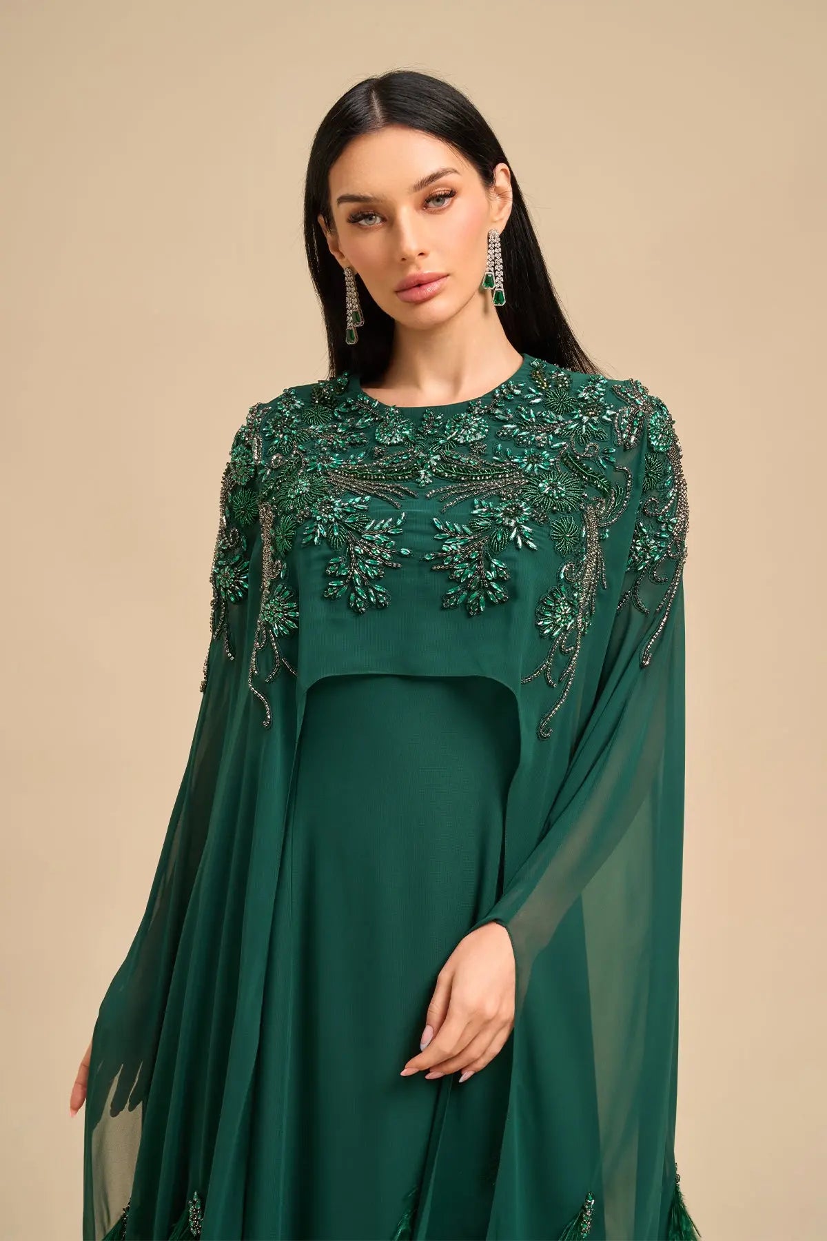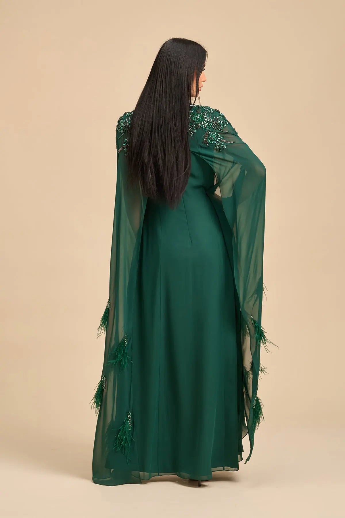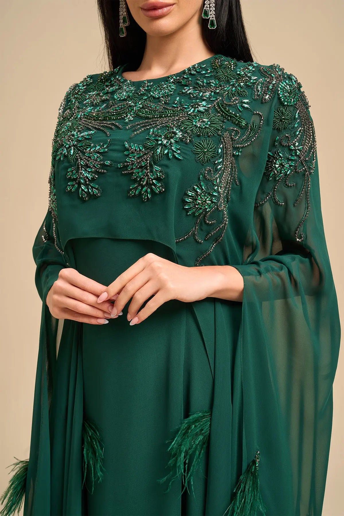 A classic evening wear kaftan dress with unique crystal, beads and luxe feather embroidery - Perfect for your next occasion