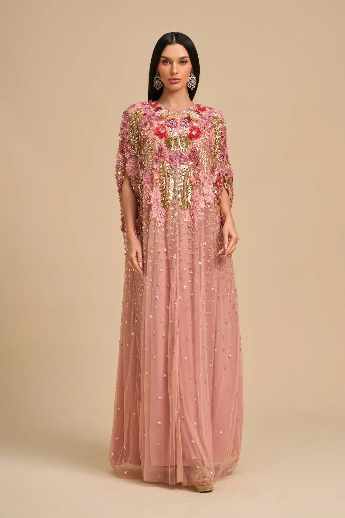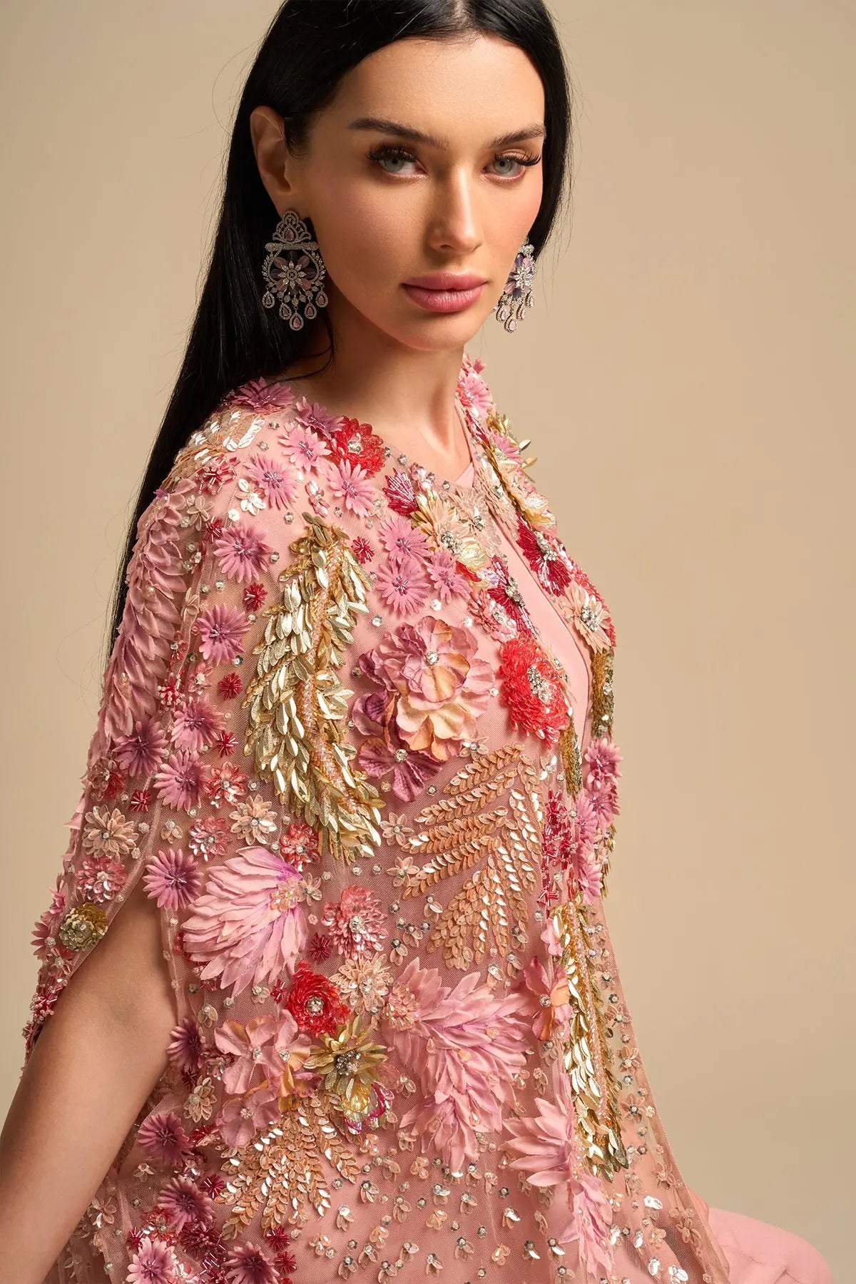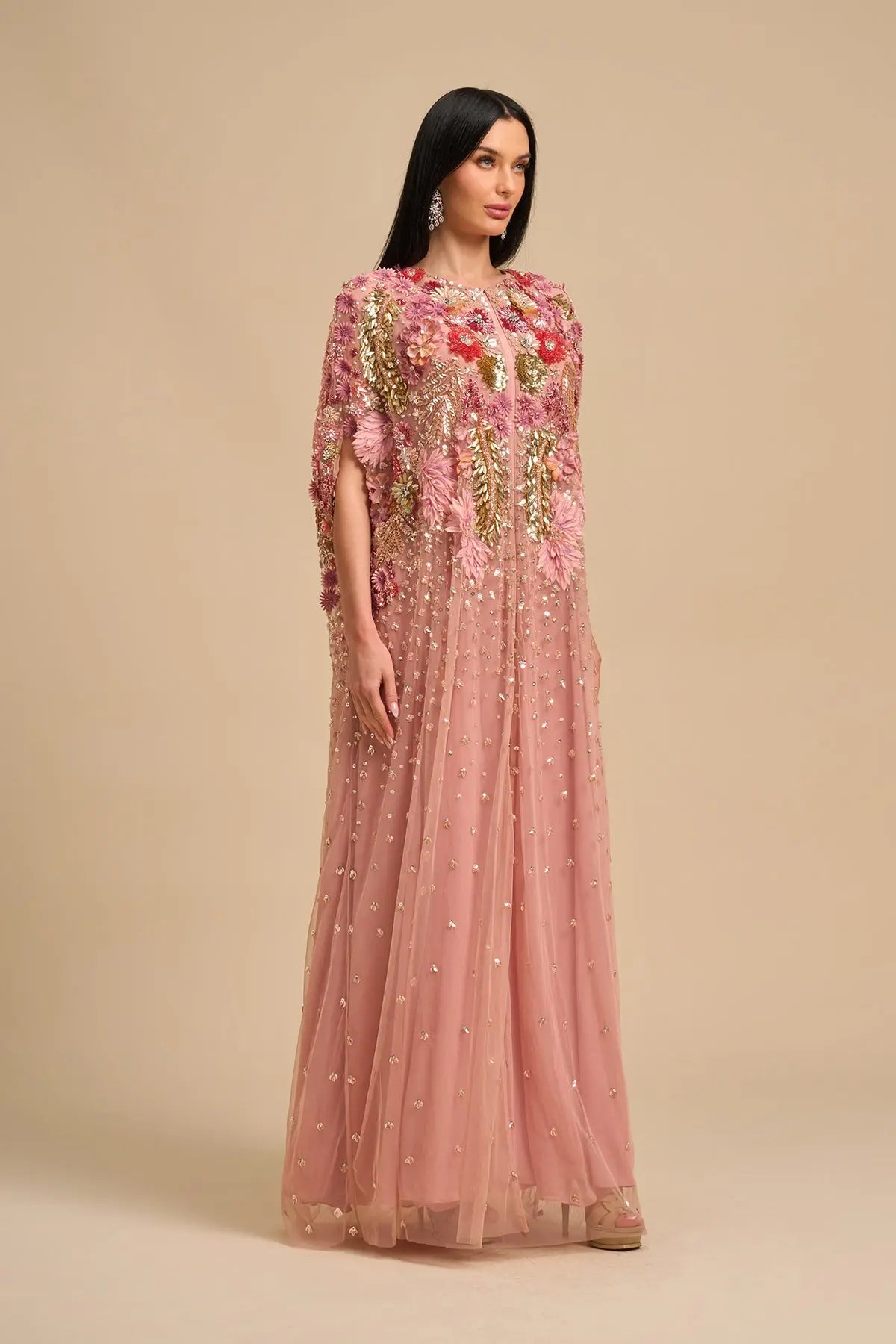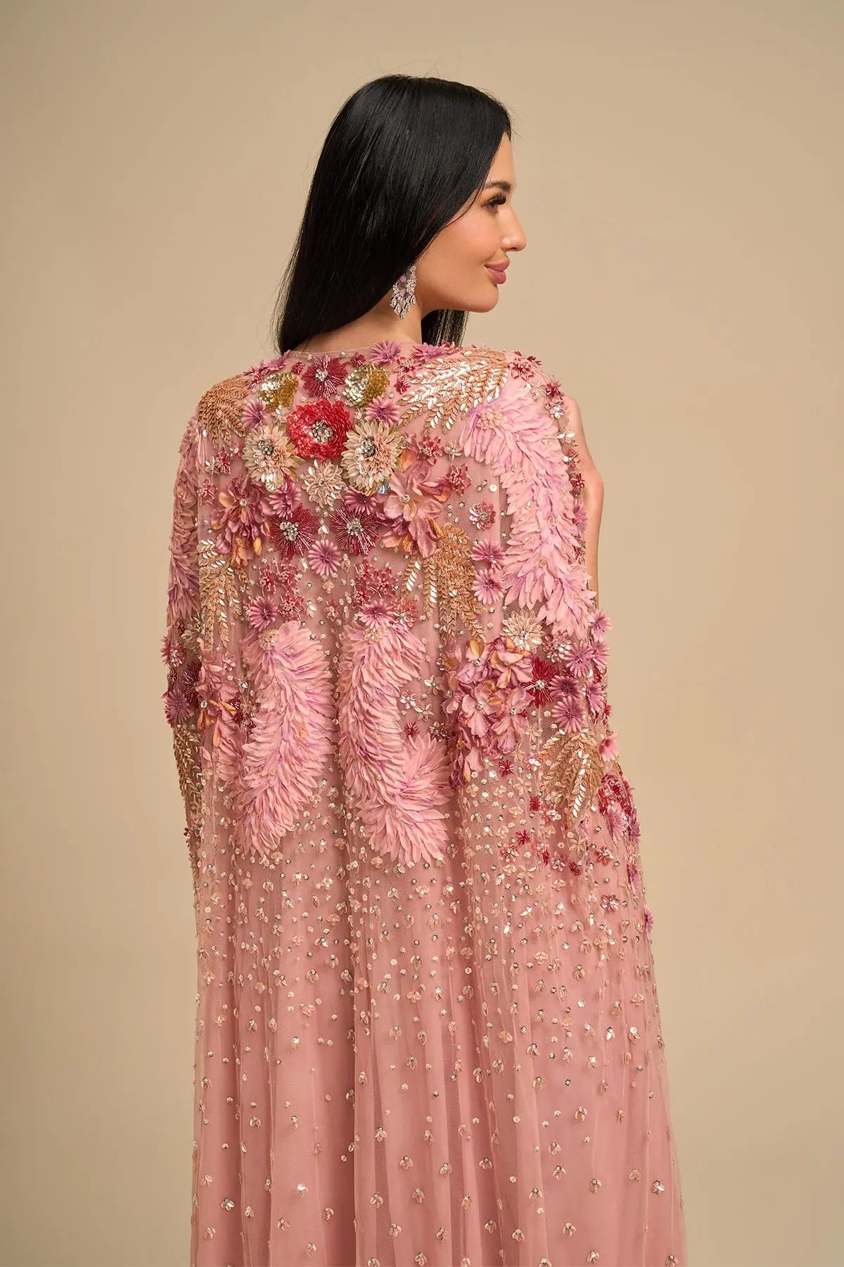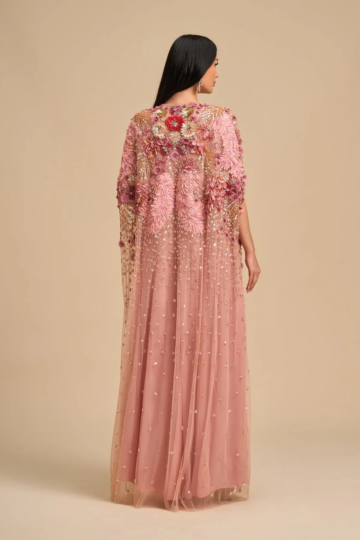 Pink Floral Cape Is Intricately Hand Embroidered Using 3D Floral Applique Embrodiery, Metallic Elements & Hand Applique . Comes With Separate Inner Dress. This Luxurious Master Piece Is Perfect For Special Occassions, Weddings And Eid