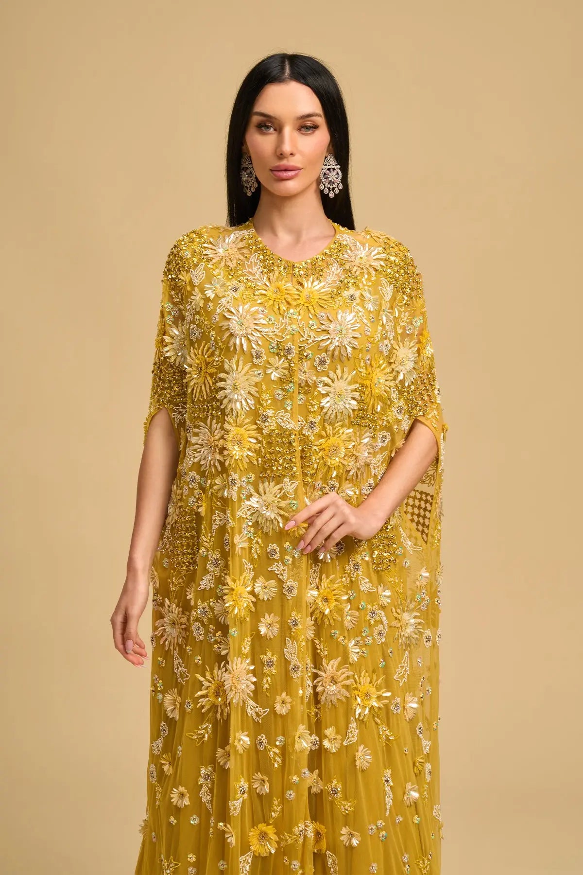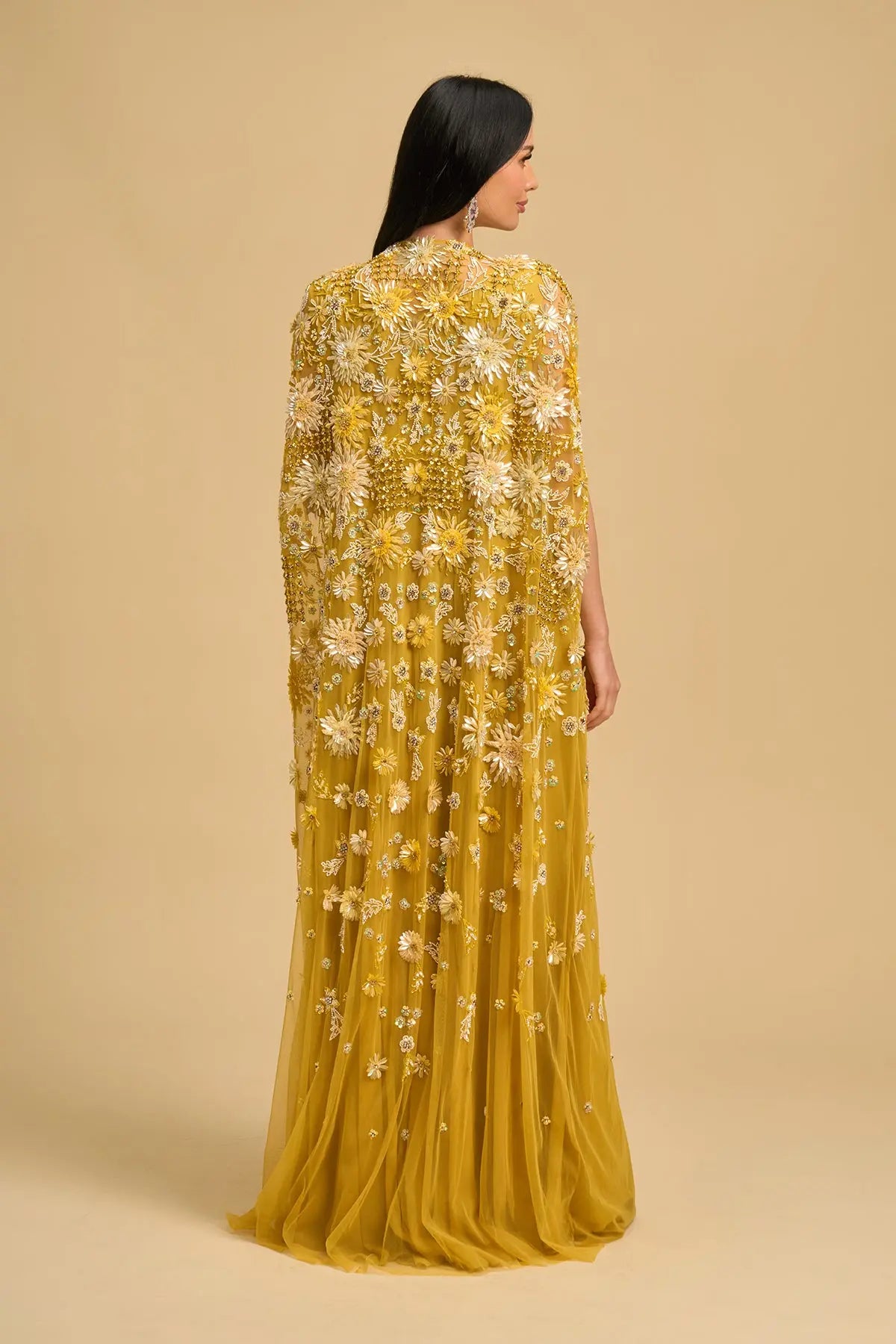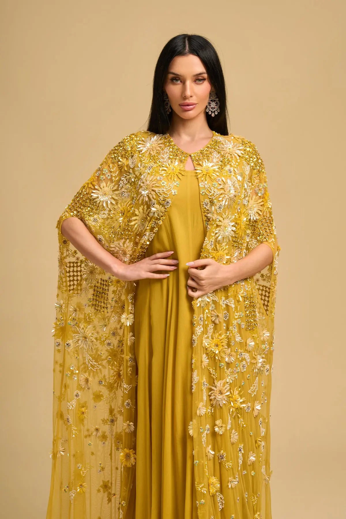 Princess cape is intricately hand embroidered using sequins, bugle beads, metallic yarn & hand applique laser cut petals. Comes with separate inner dress