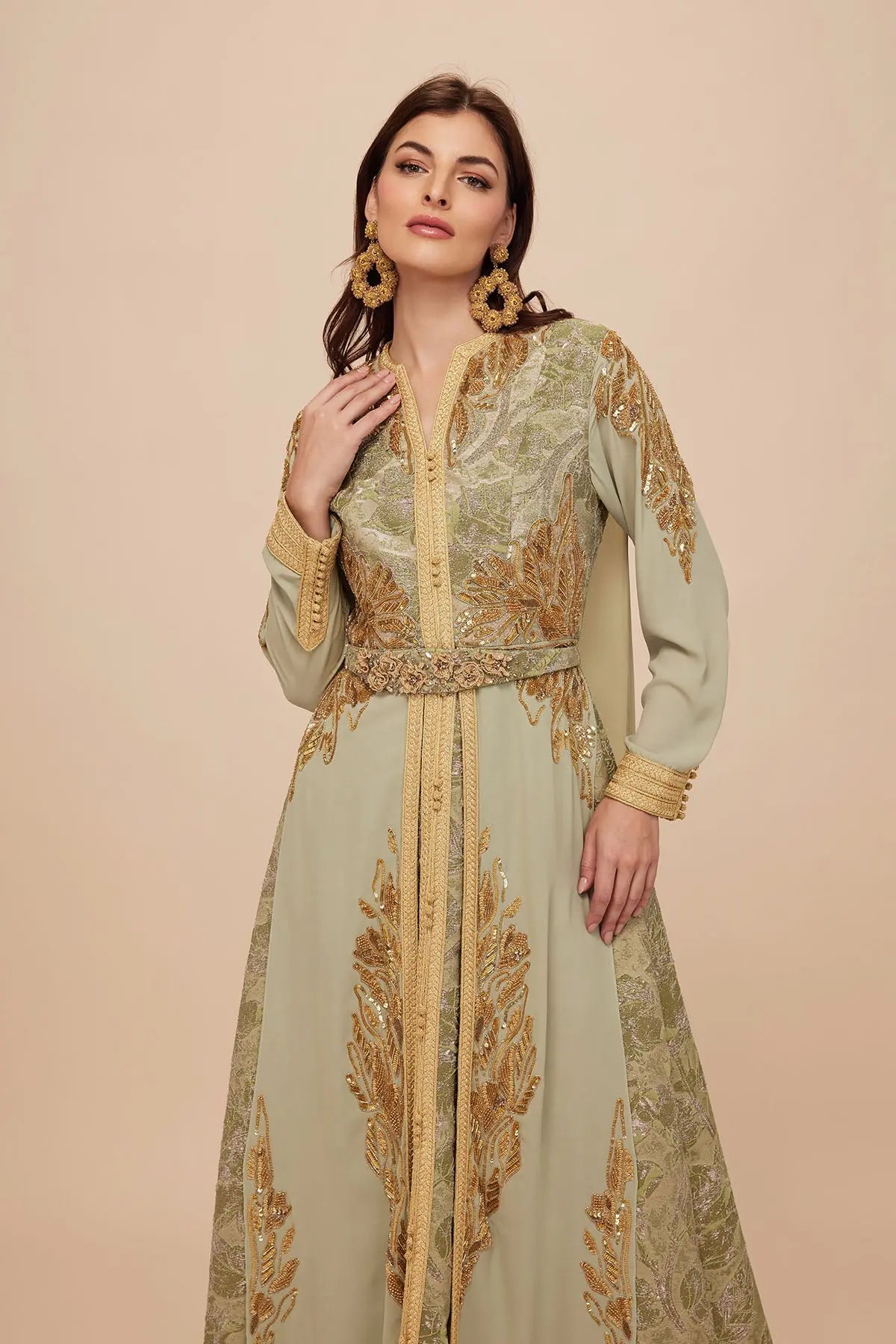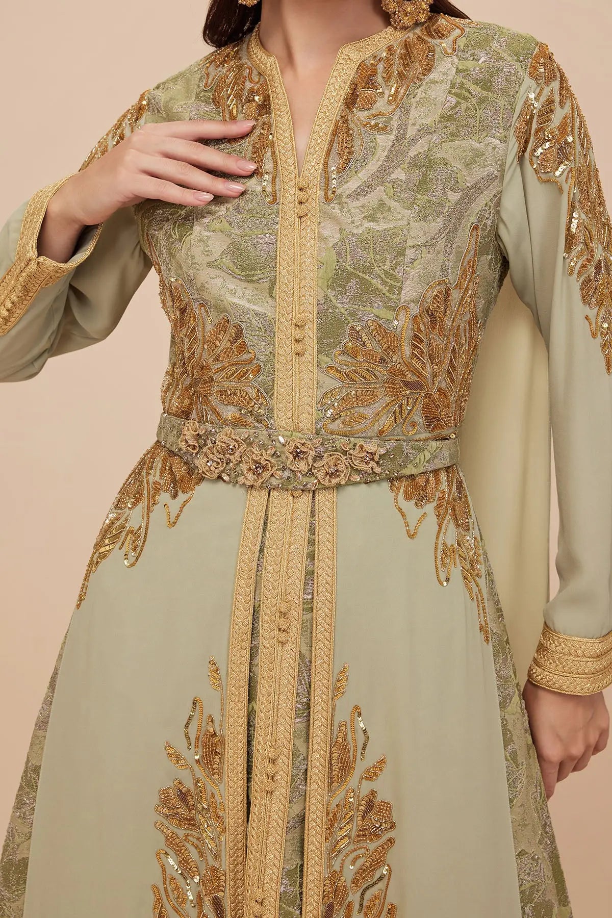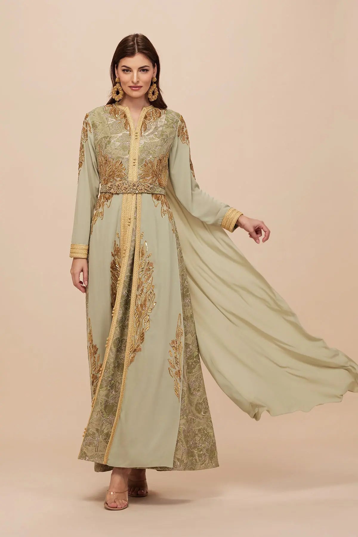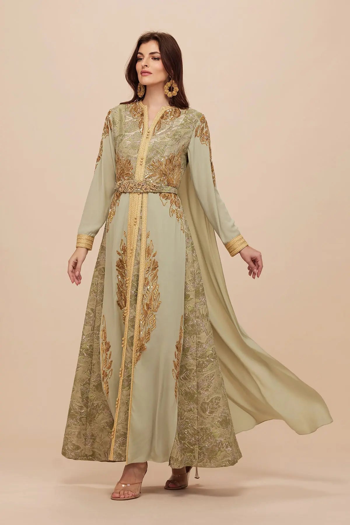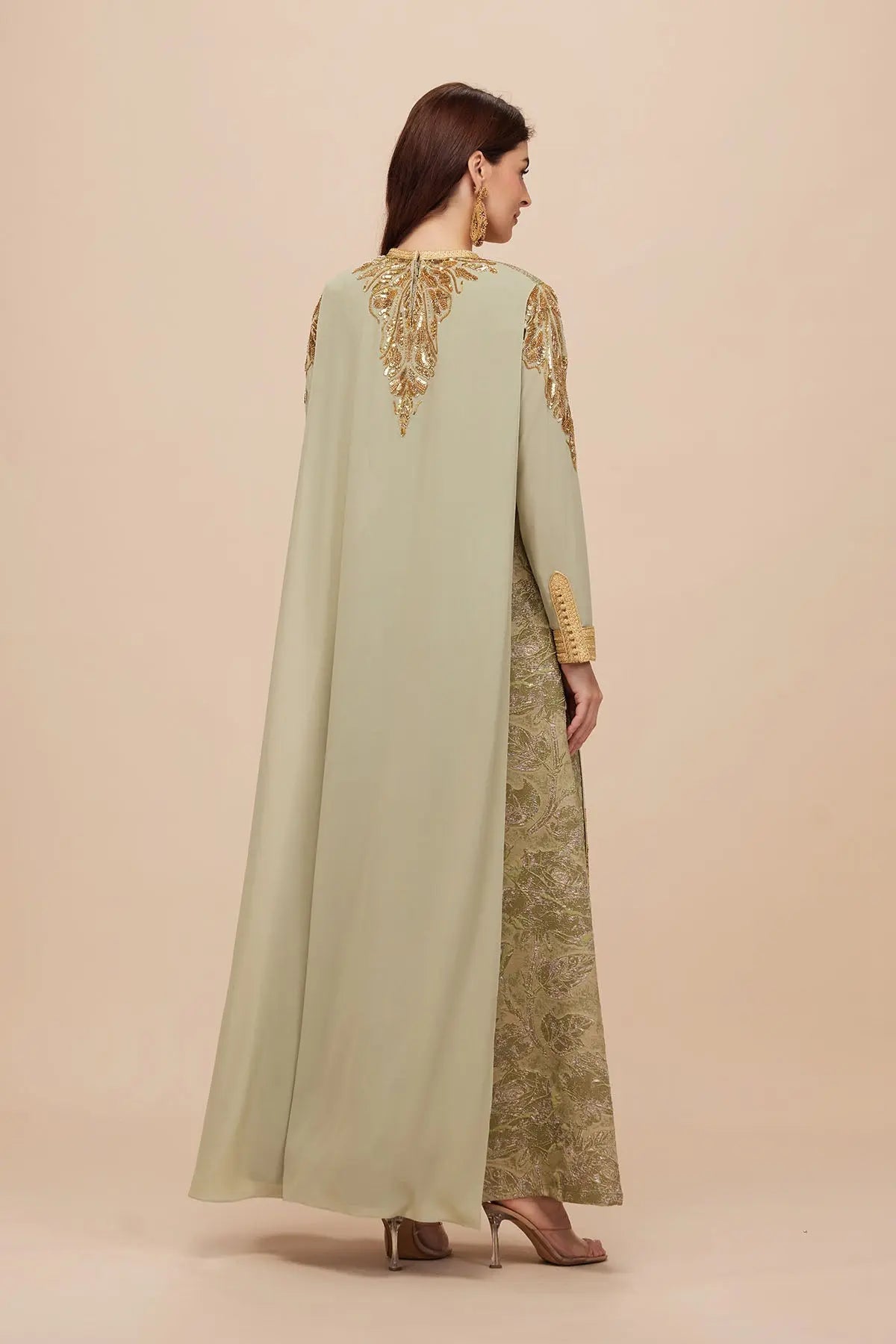 Modern moroccon kaftan set in brocade and crepe - Luxe gold sequins embroidery - Back cape design - Separate Belt