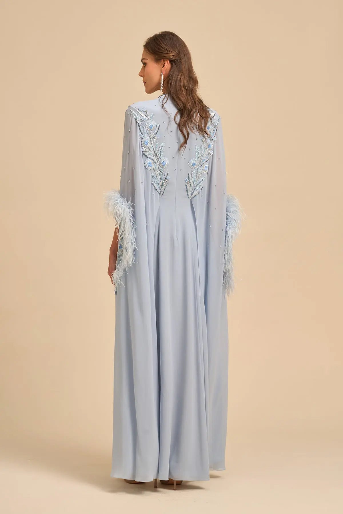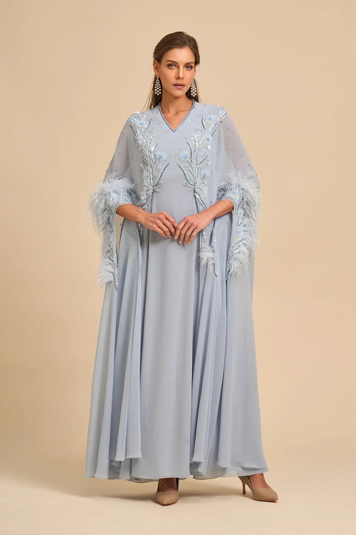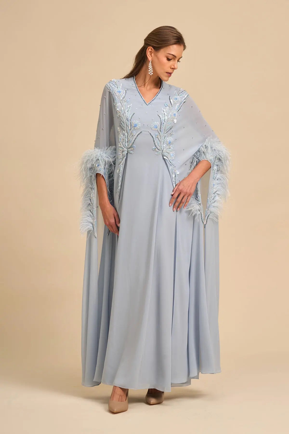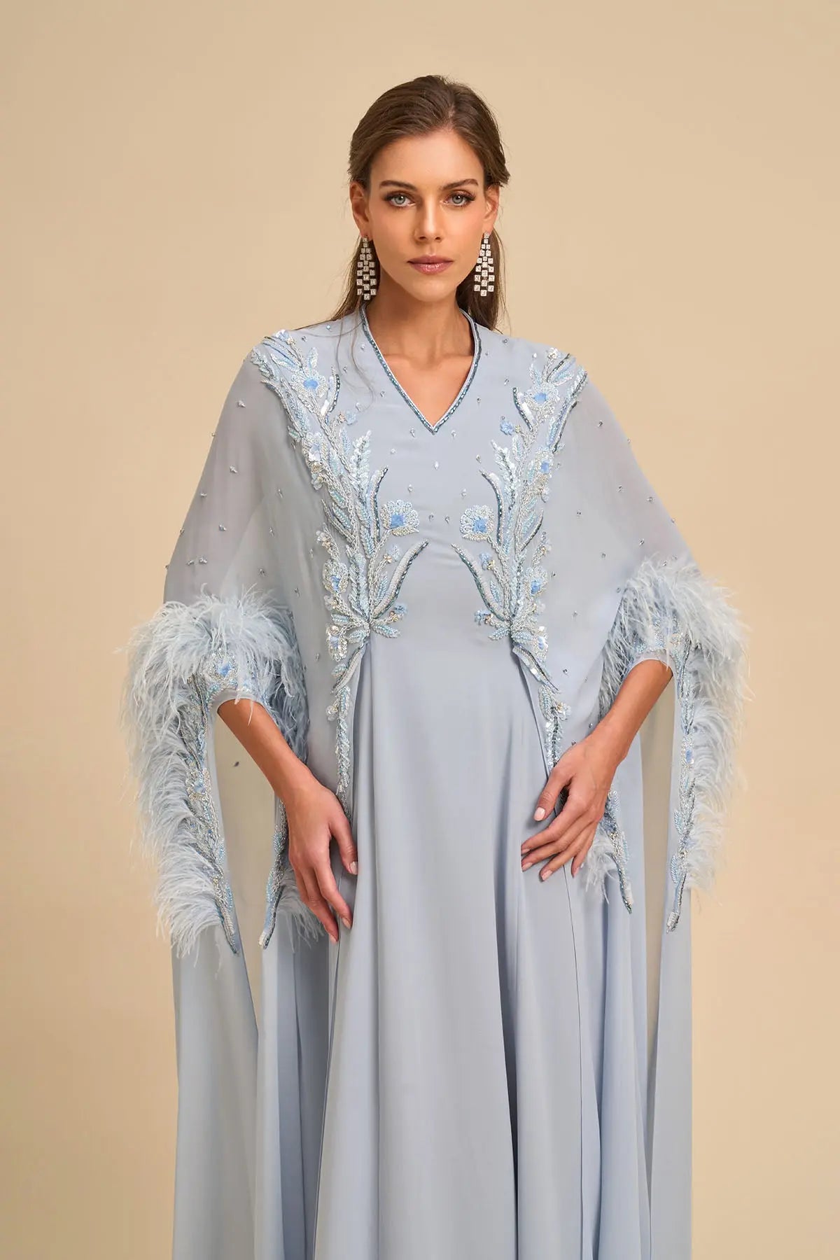 Powder Blue is the colour of the season. This Shaira Couture’s kaftan features sequin embellishments and feather trims. The relaxed silhouette adds comfort and elegance, making it suitable for special occasions.