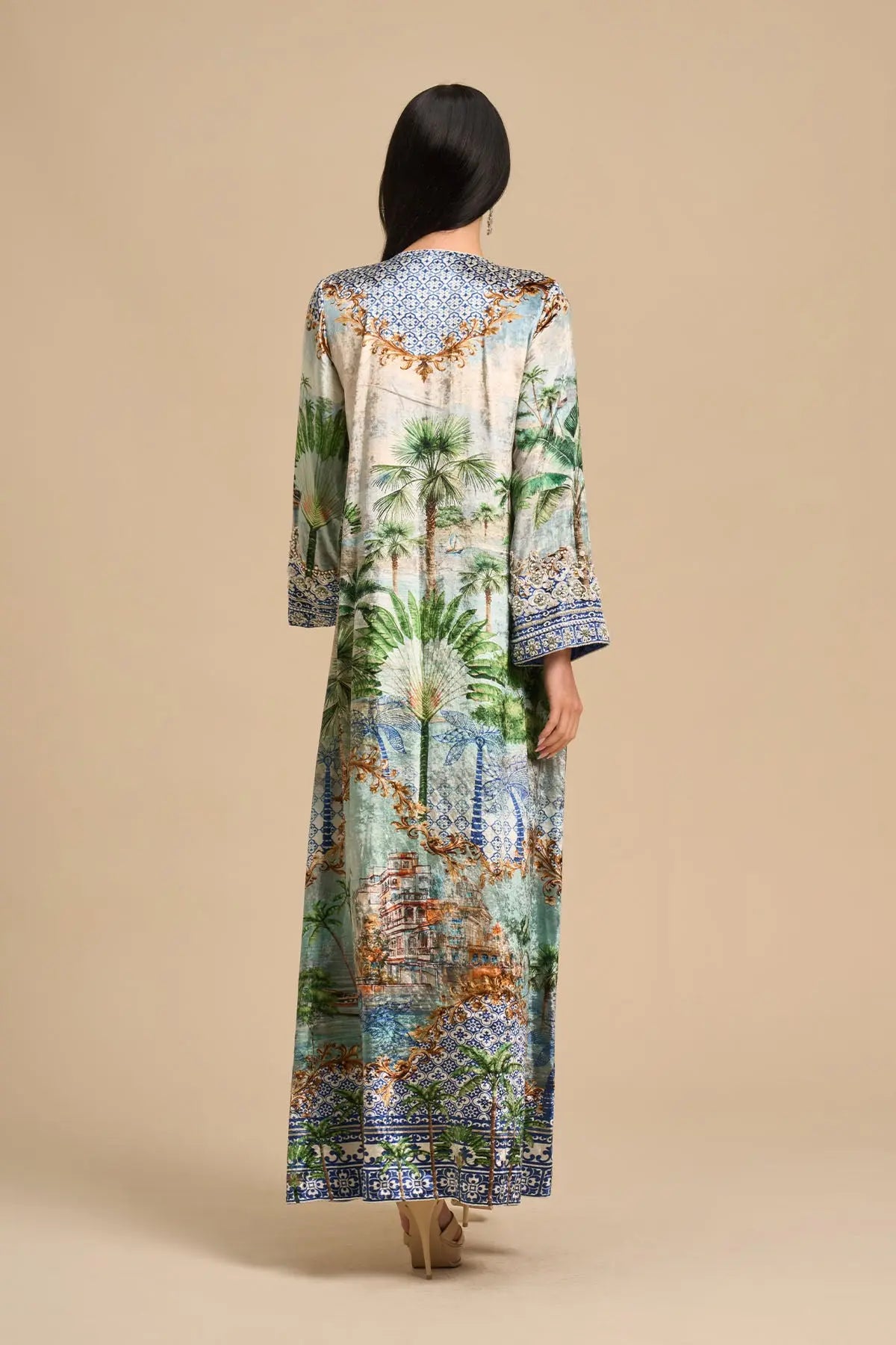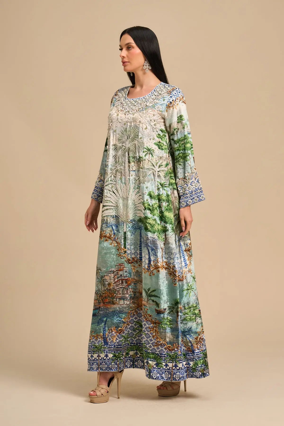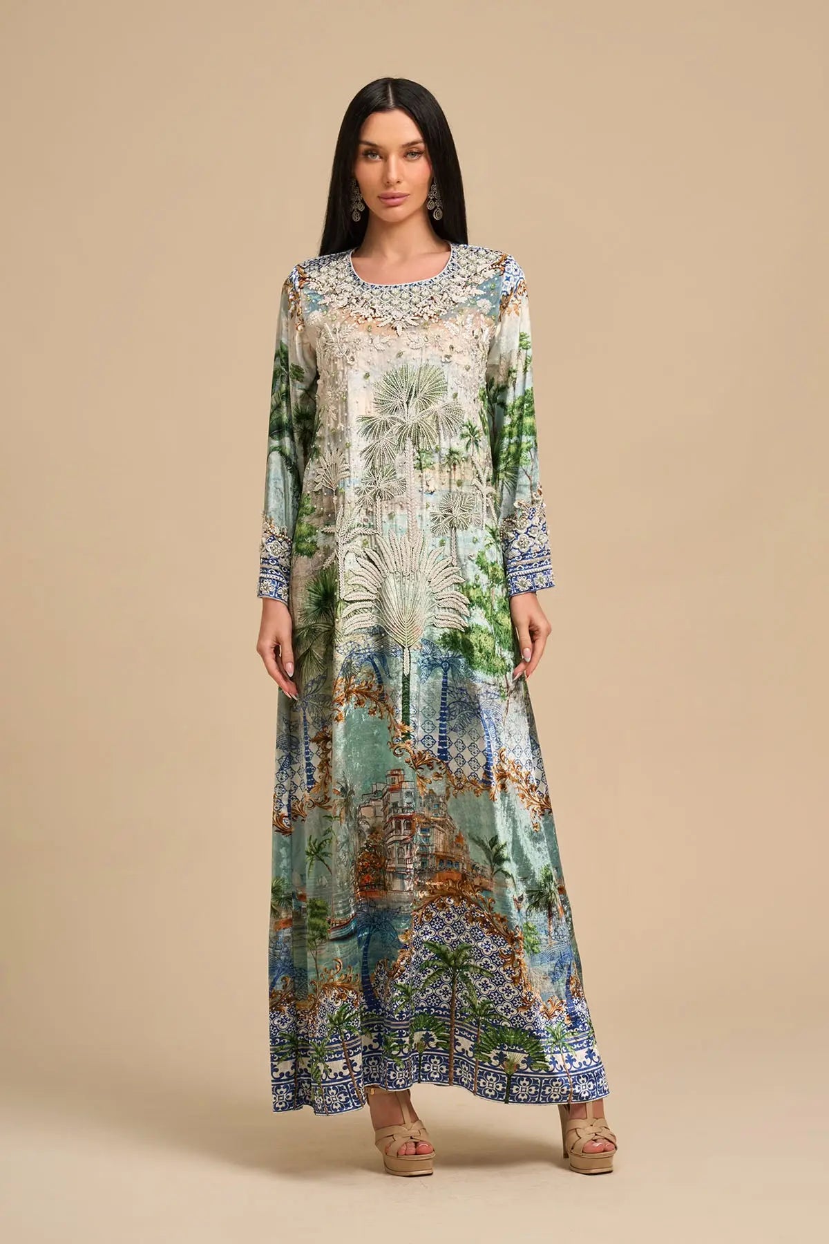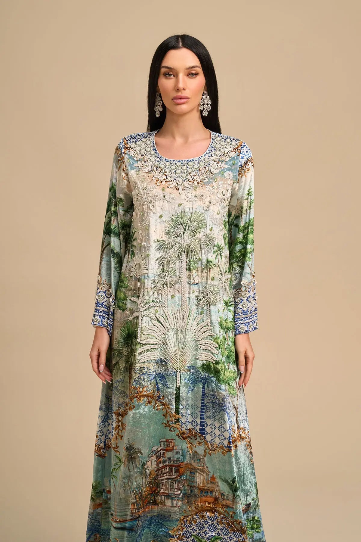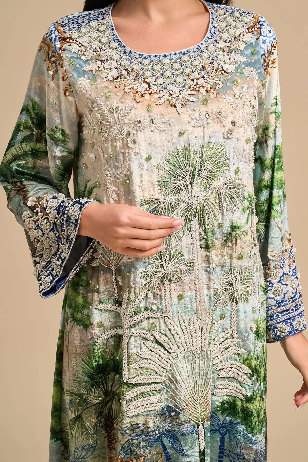 Long sleeves velvet kaftan with luxe white beads and sequins embroidery