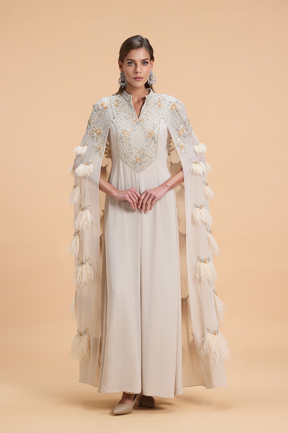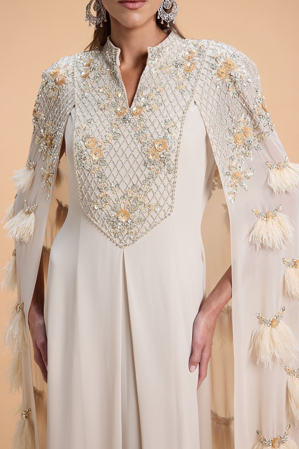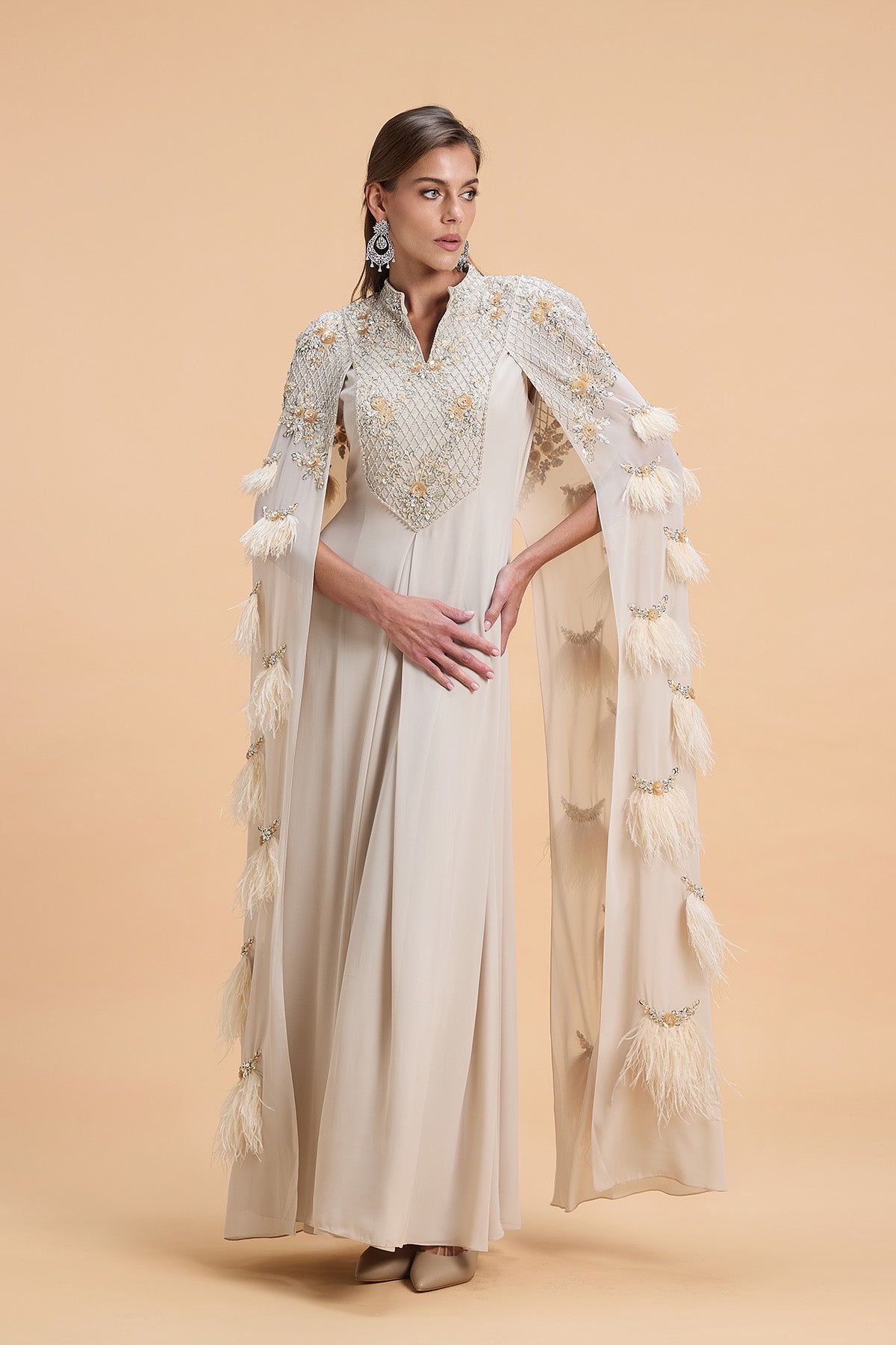 Cape style kaftan with luxurious sequins and feather embroidery on the sleeve capes. Floral Geometric Pattern Sequins Beads embroidery on the yoke.