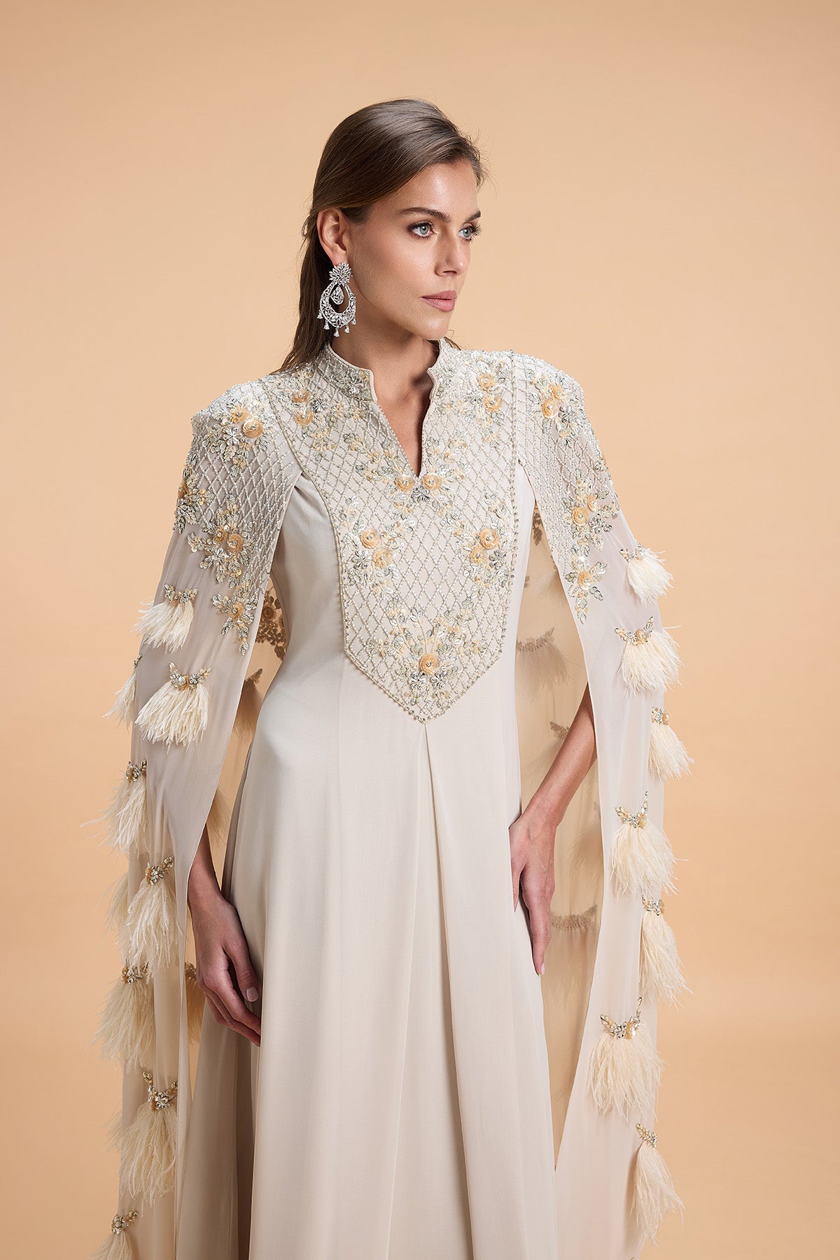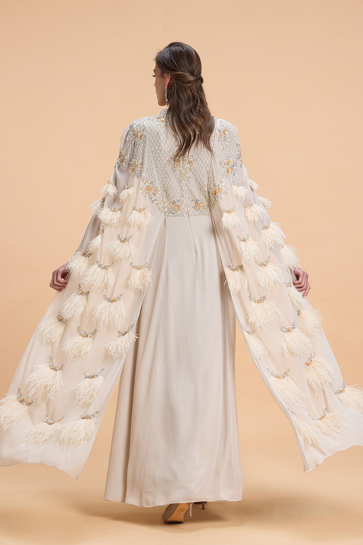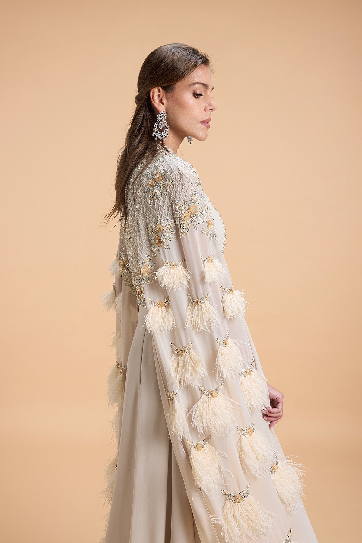 Cape style kaftan with luxurious sequins and feather embroidery on the sleeve capes. Floral Geometric Pattern Sequins Beads embroidery on the yoke.