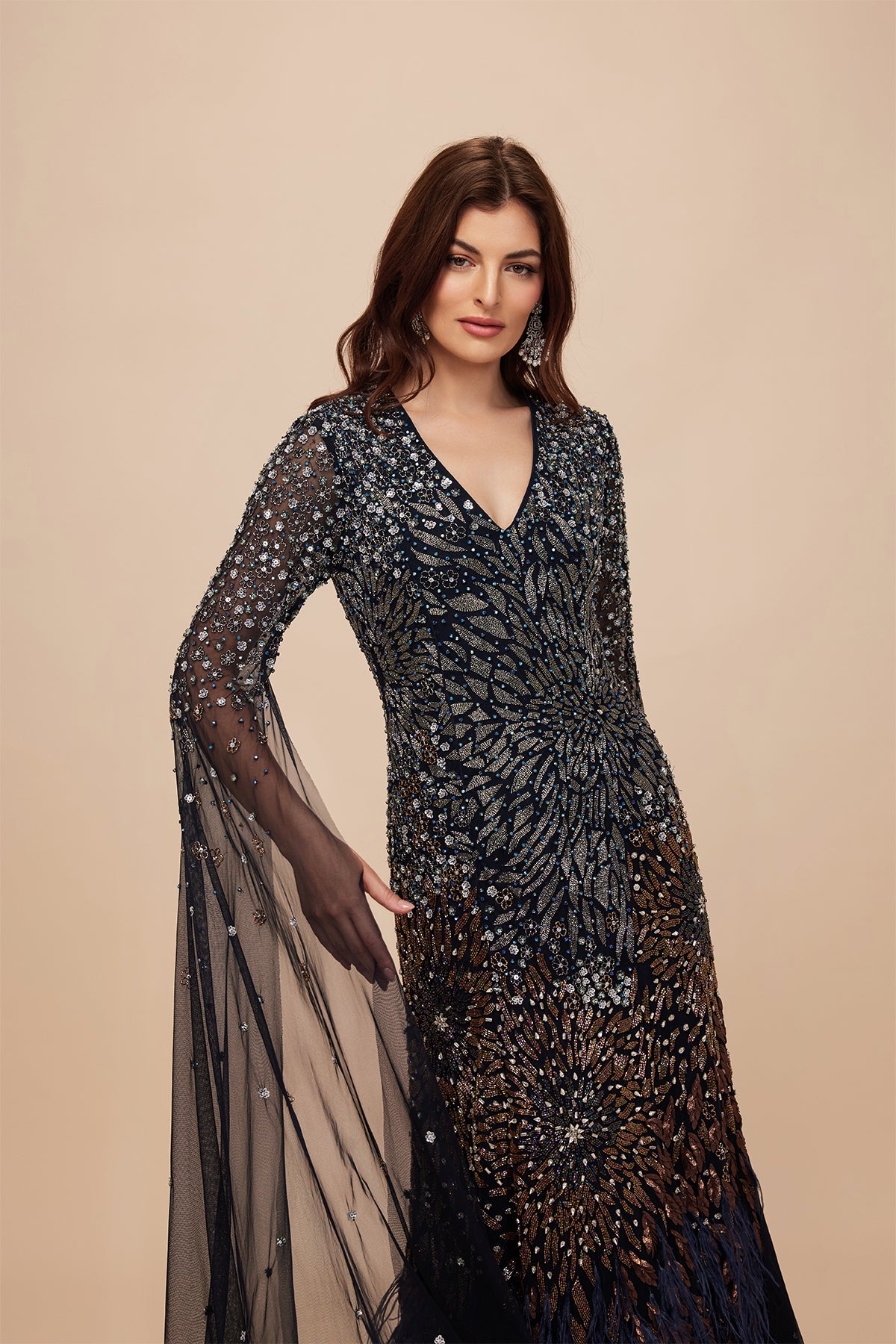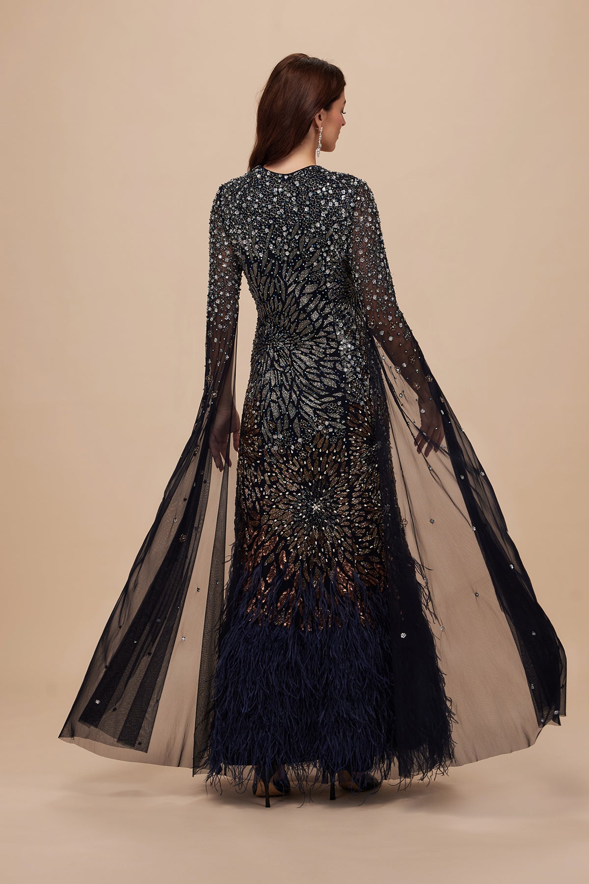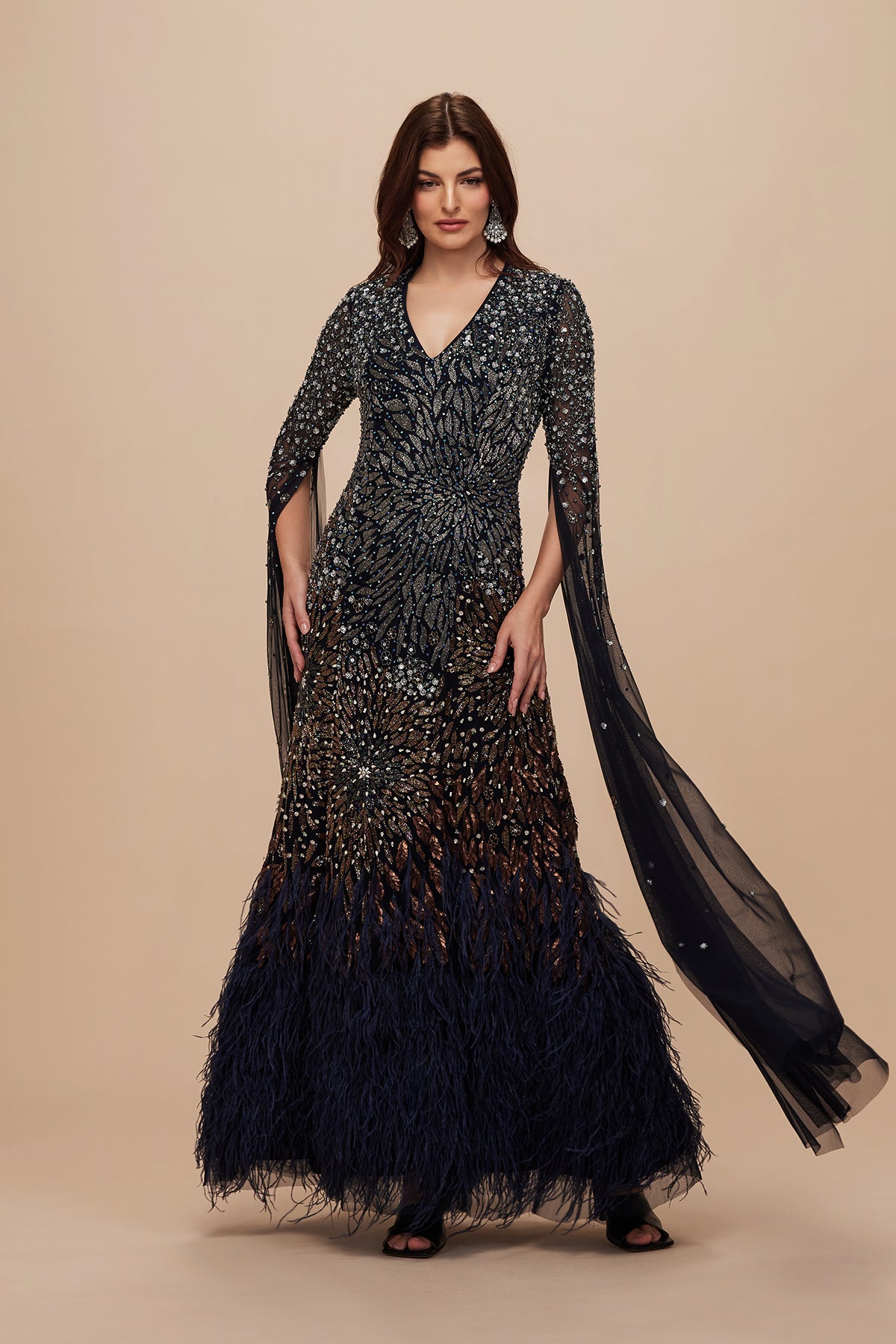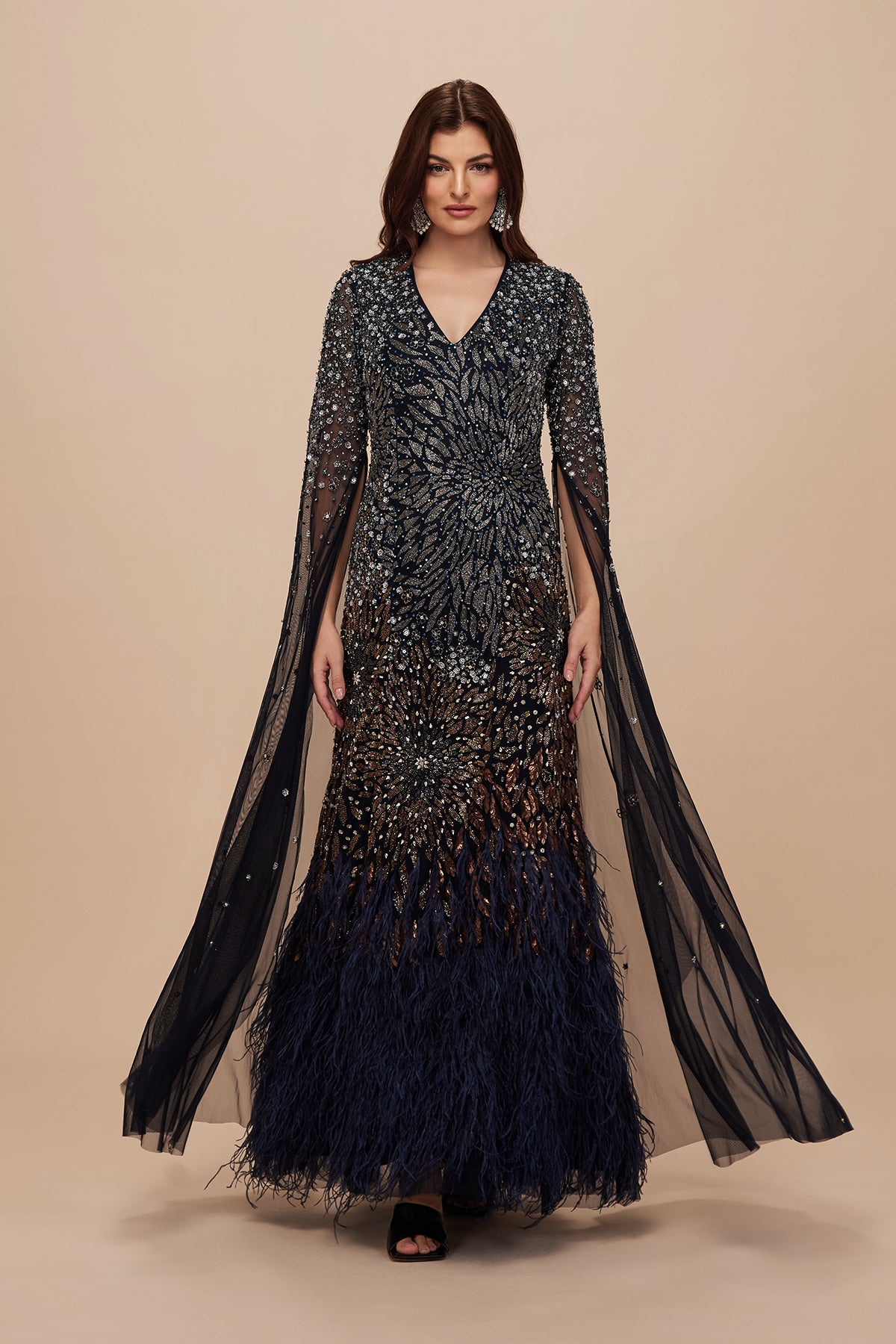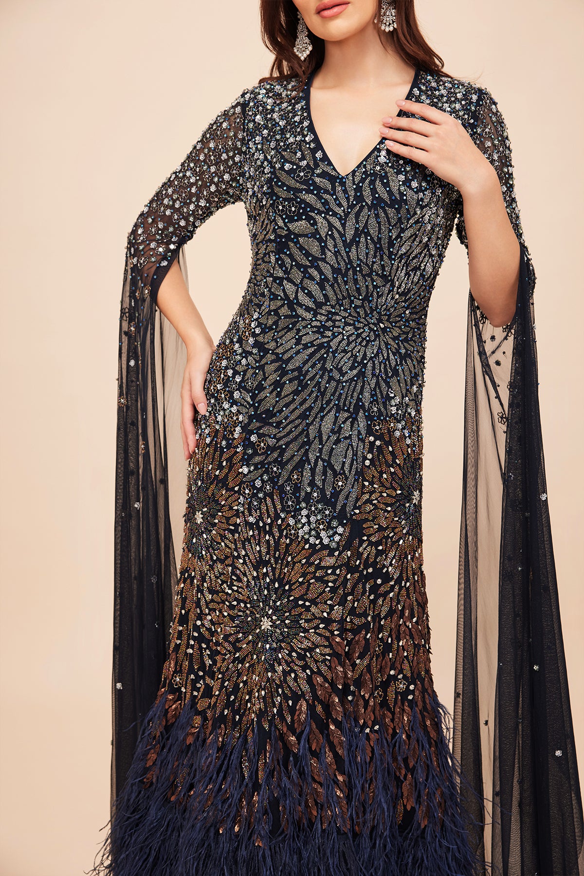 Star gazing dress consists of intricate floral pattern sequins and cut beads stone embroidery - Tulle drape sleeves with sequins embroidery - Feather detailing at the hem