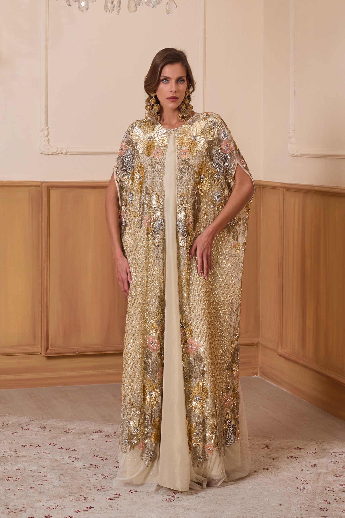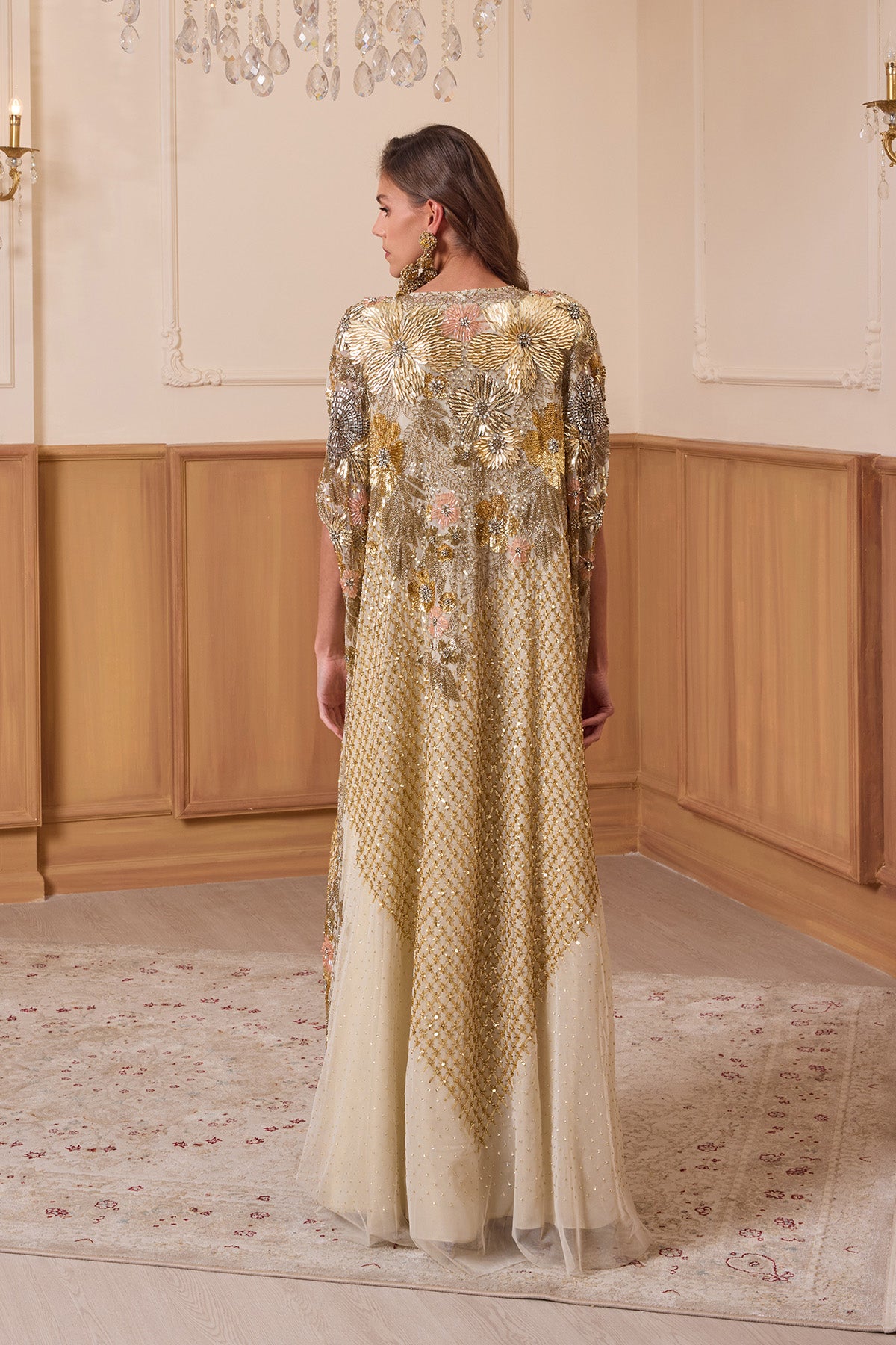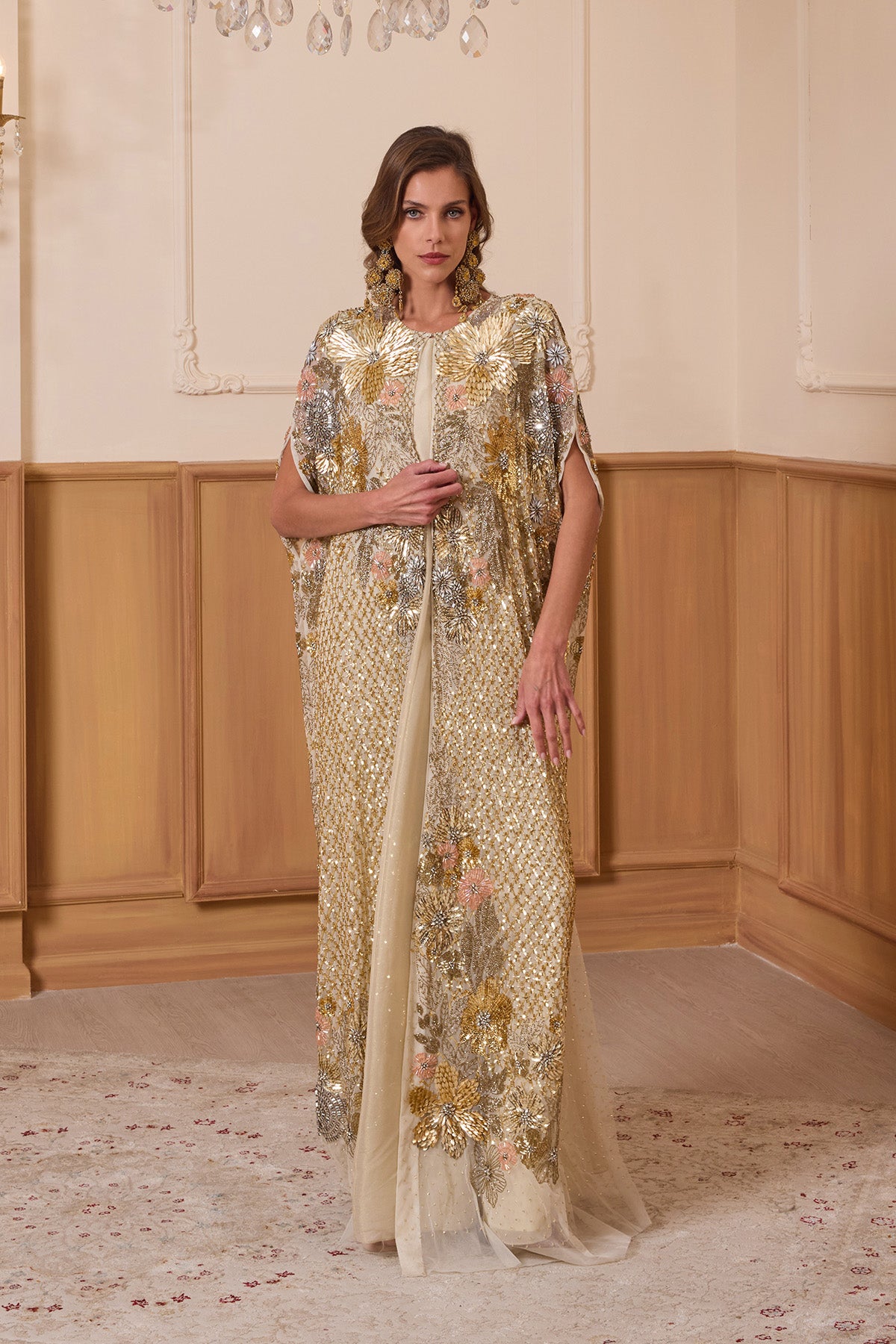 London Eye long cape is intricately hand embroidered using luxurious floral sequins, muticolour beads & hand applique laser cut floral elements. Comes with separate inner dress