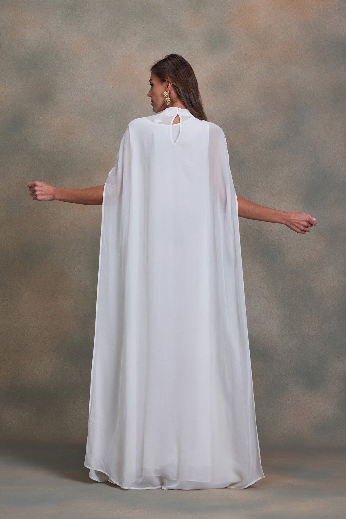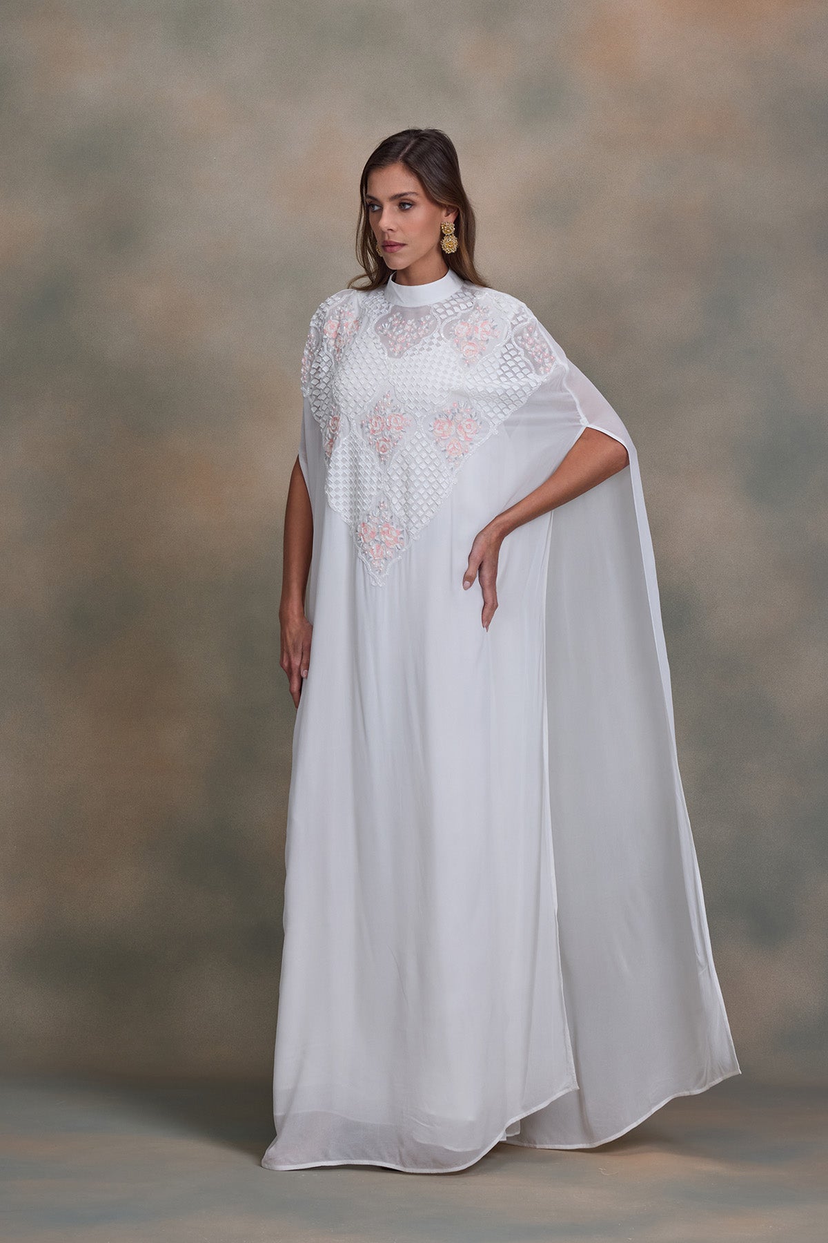 2 Piece Cape And Dress with laser cut geometric floral applique placement embroidery