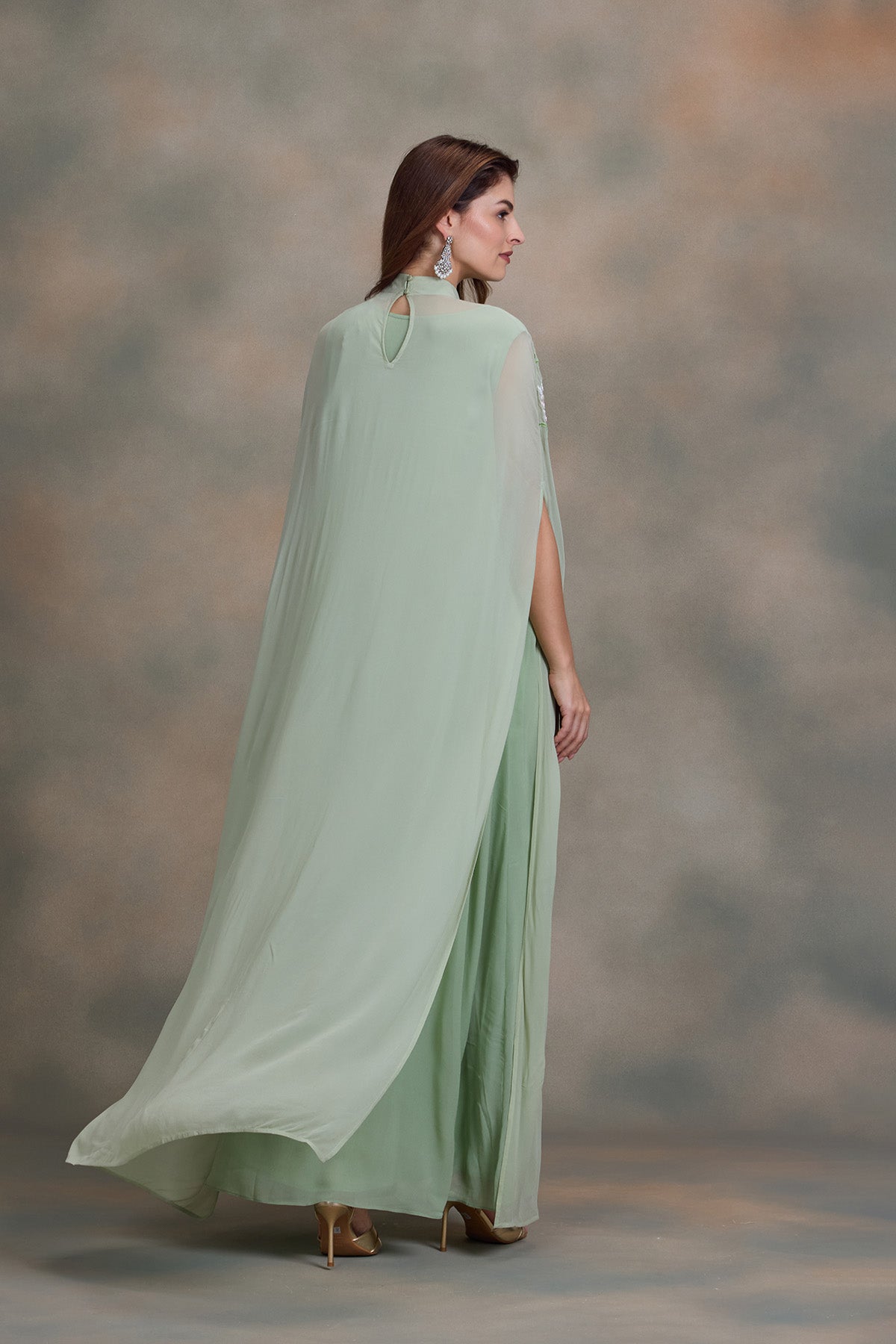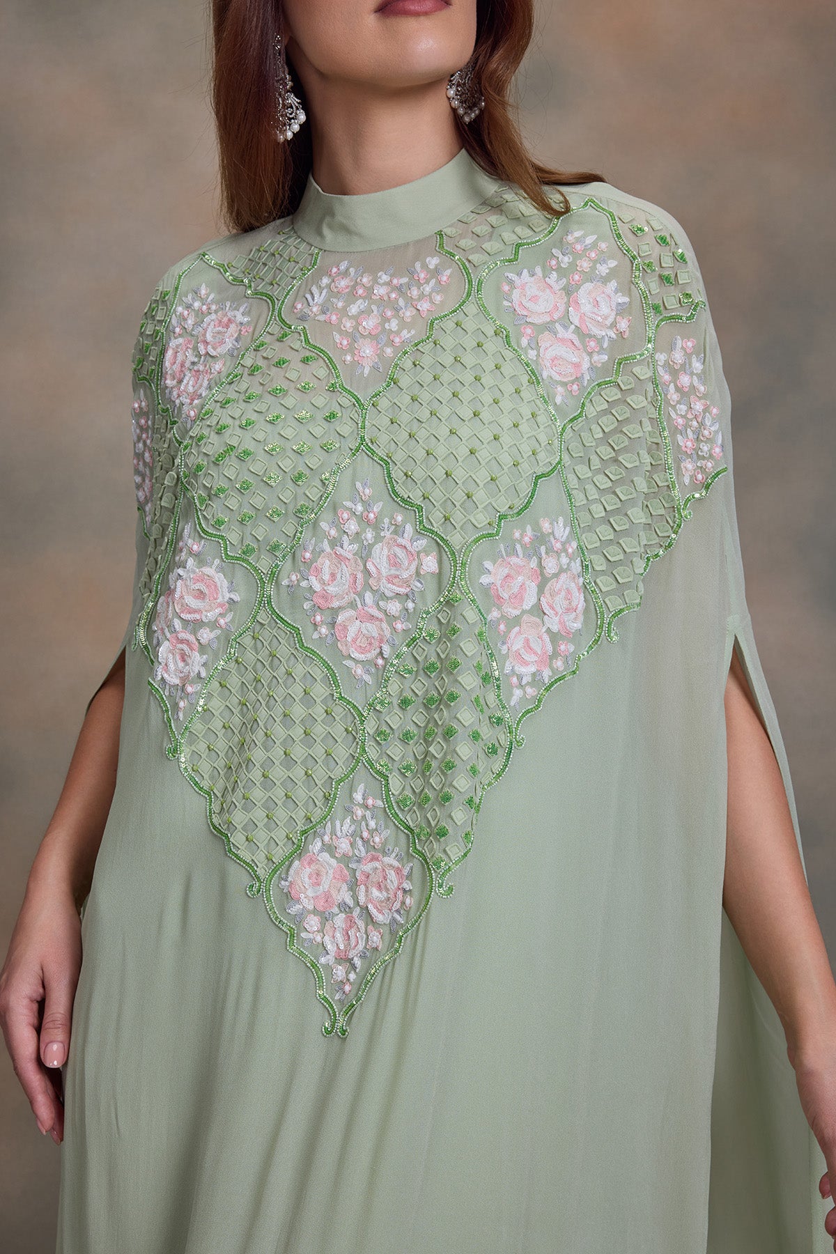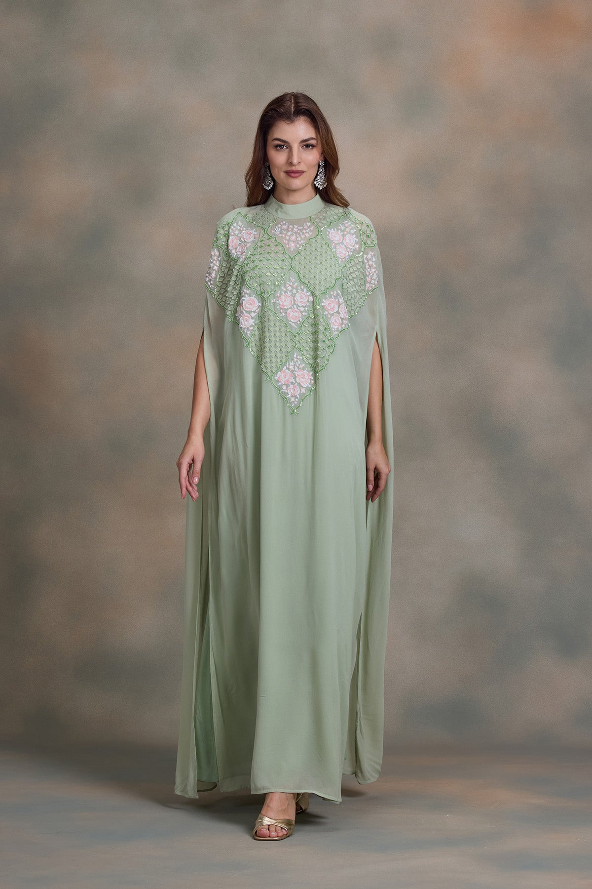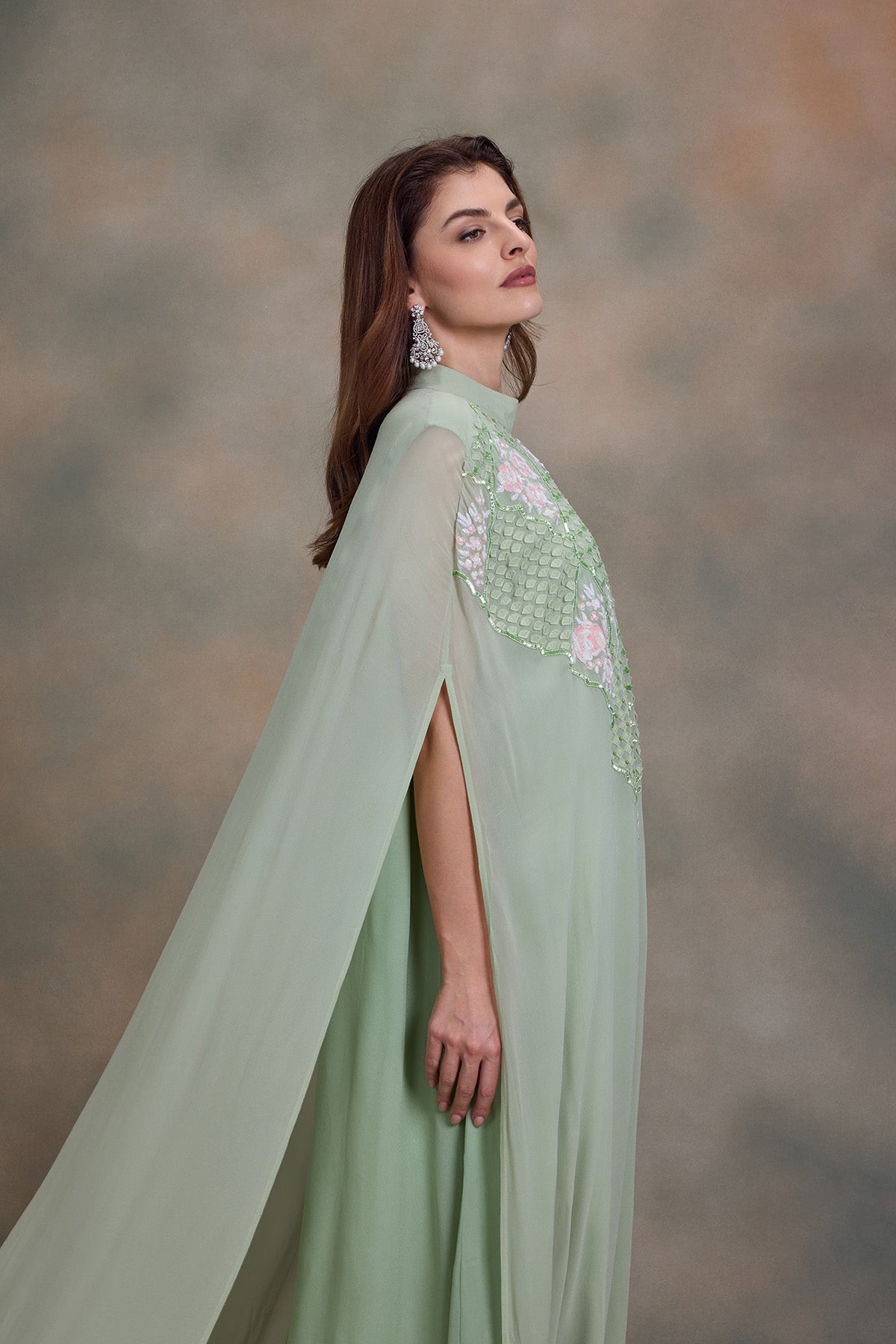 2 Piece Cape And Dress with laser cut geometric floral applique placement embroidery