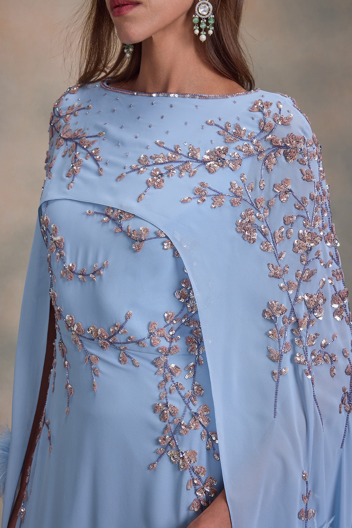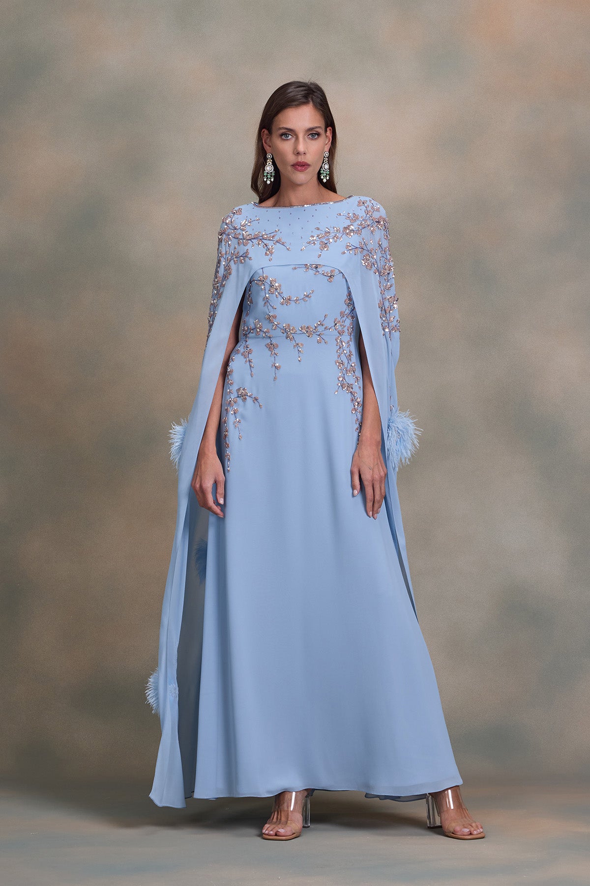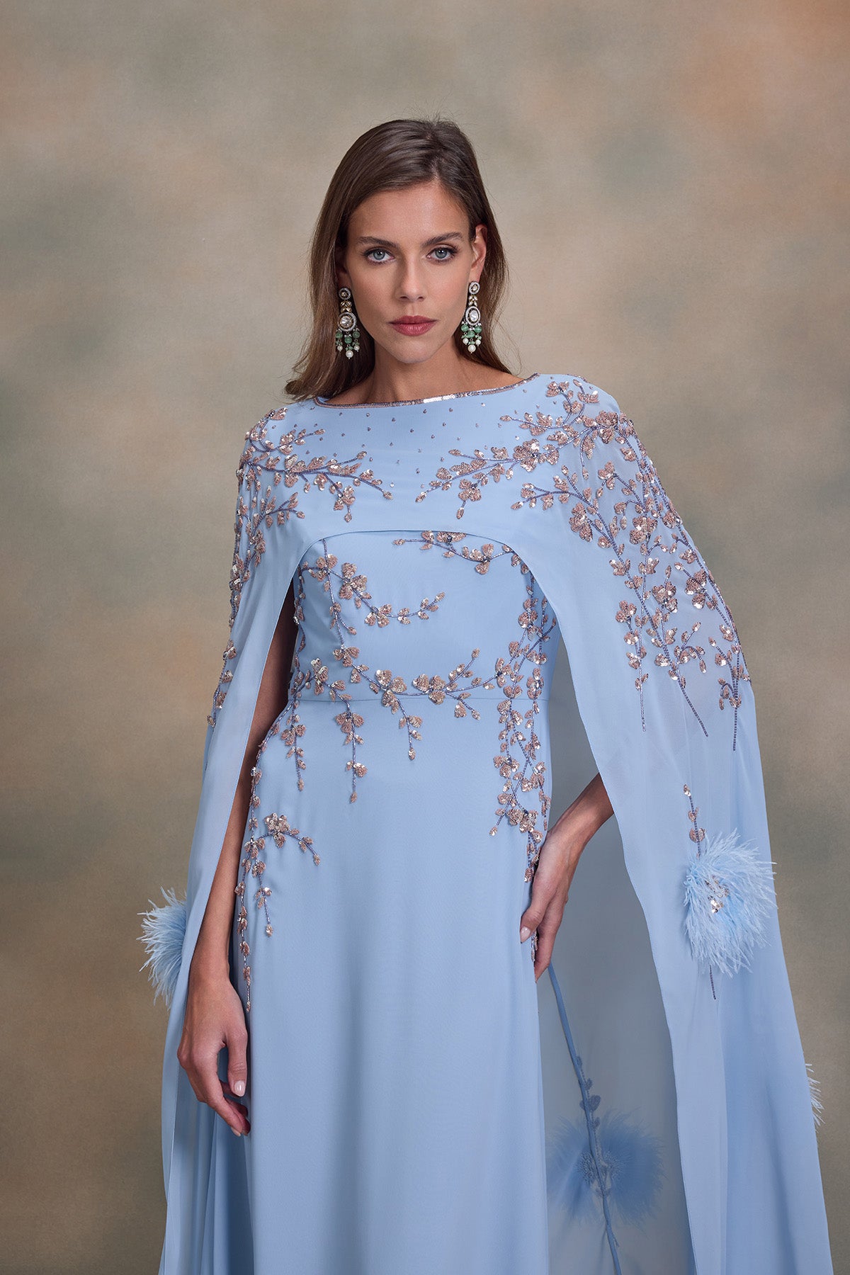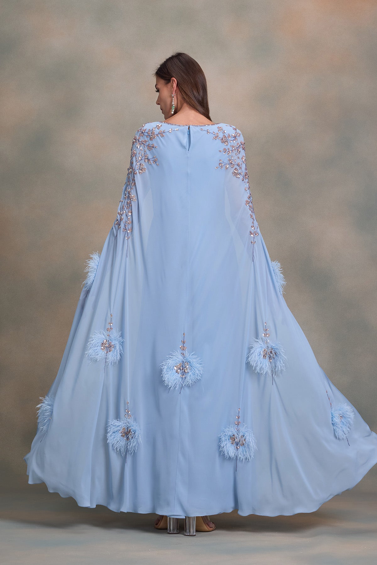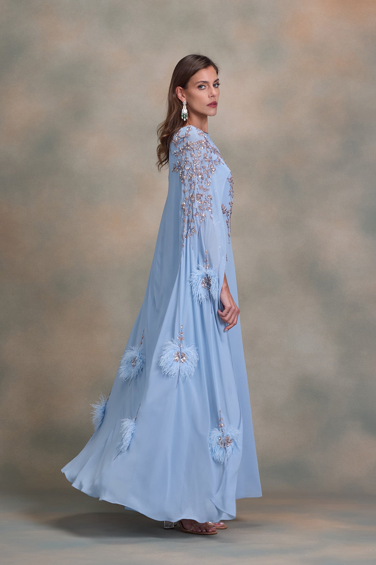 2 Piece Kaftan set with separate cape - Luxe sequins and feather embroidery details